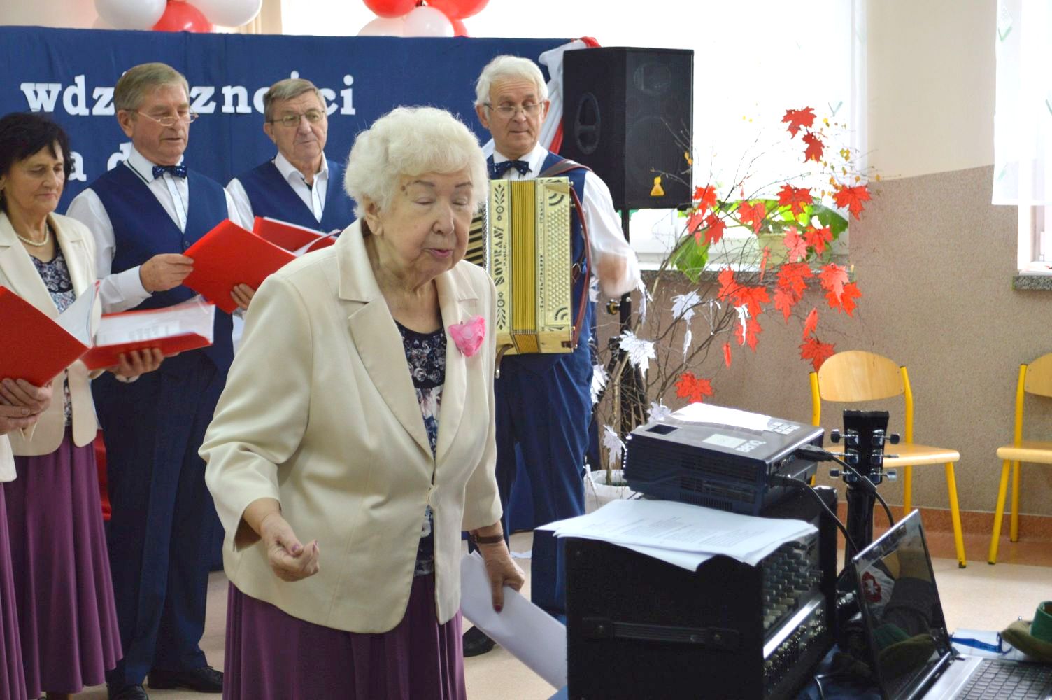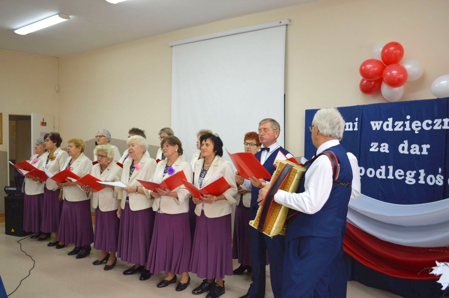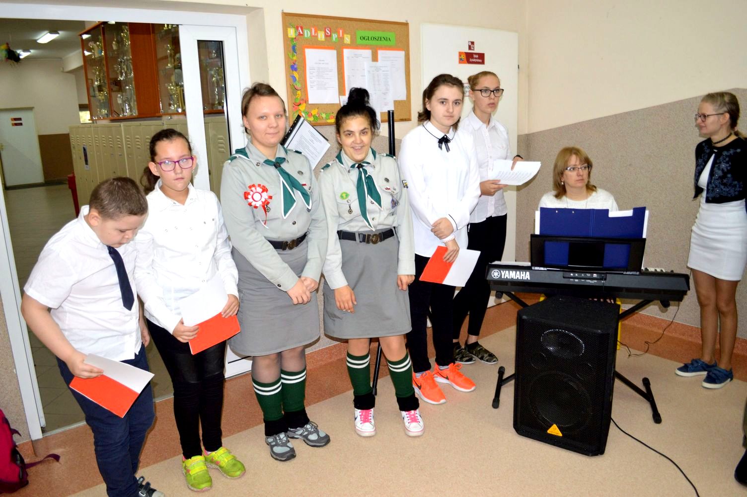 Świętowanie w dniu 9 listopada rozpoczęliśmy od wczesnych godzin porannych. Najpierw uczniowie wraz z nauczycielami wykonali rozetki i chorągiewki w narodowych barwach. Przybyłych na uroczystość gości serdecznie powitał Pan wicedyrektor Waldemar Prokopczuk. Następnie wysłuchaliśmy koncertu pieśni patriotycznych „ Dla Niepodległej” w wykonaniu zespołu Seniorynki, pod kierunkiem Pana Piotra Kucharka kierownika muzycznego, przy akompaniamencie Kazimierza Wcisłaka, a także utworów sławiących piękno ziemi sokołowskiej i mazowieckiej autorstwa Pani Danuty Kalinowskiej założycielki zespołu i kierownik artystycznej.