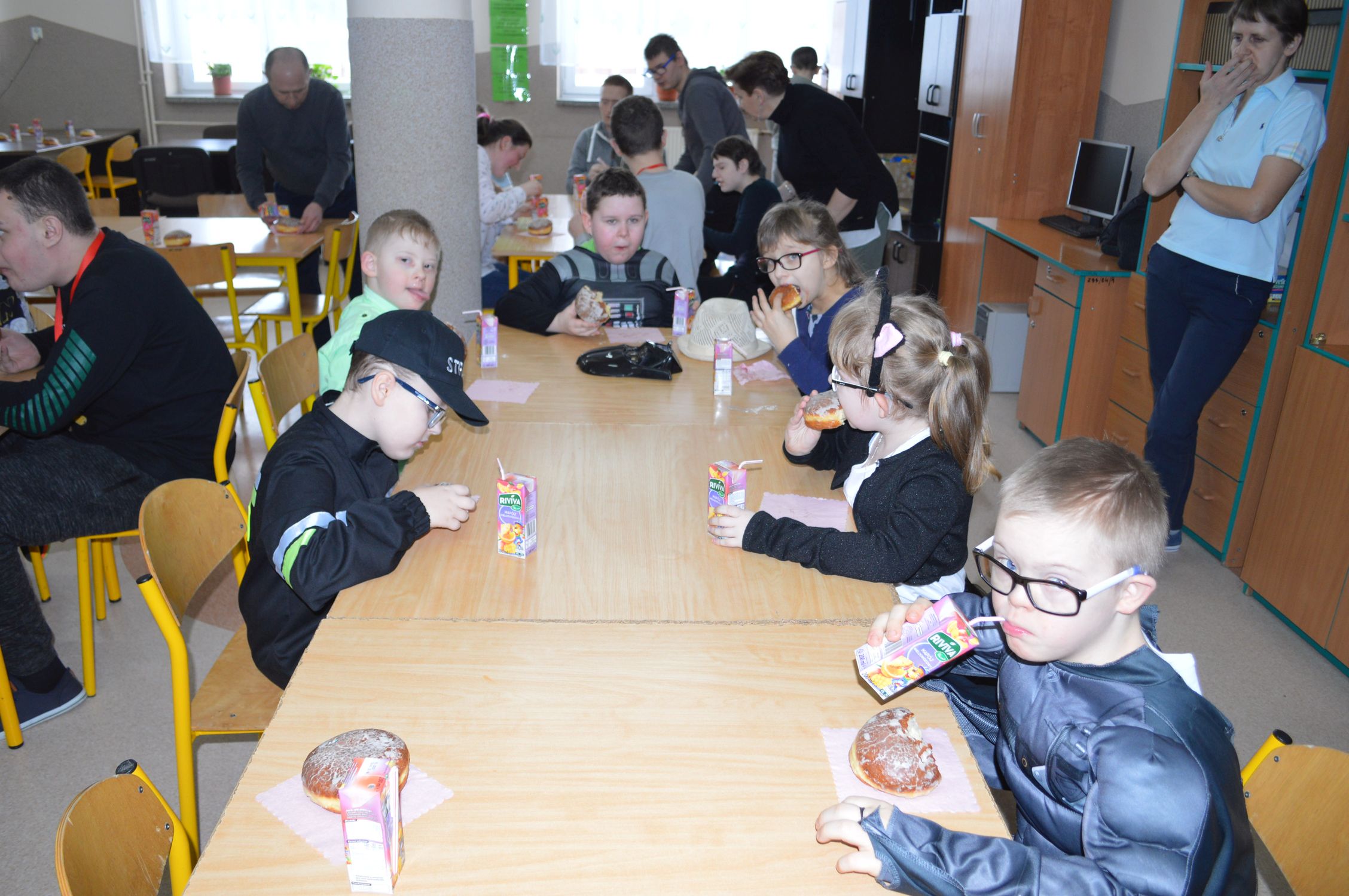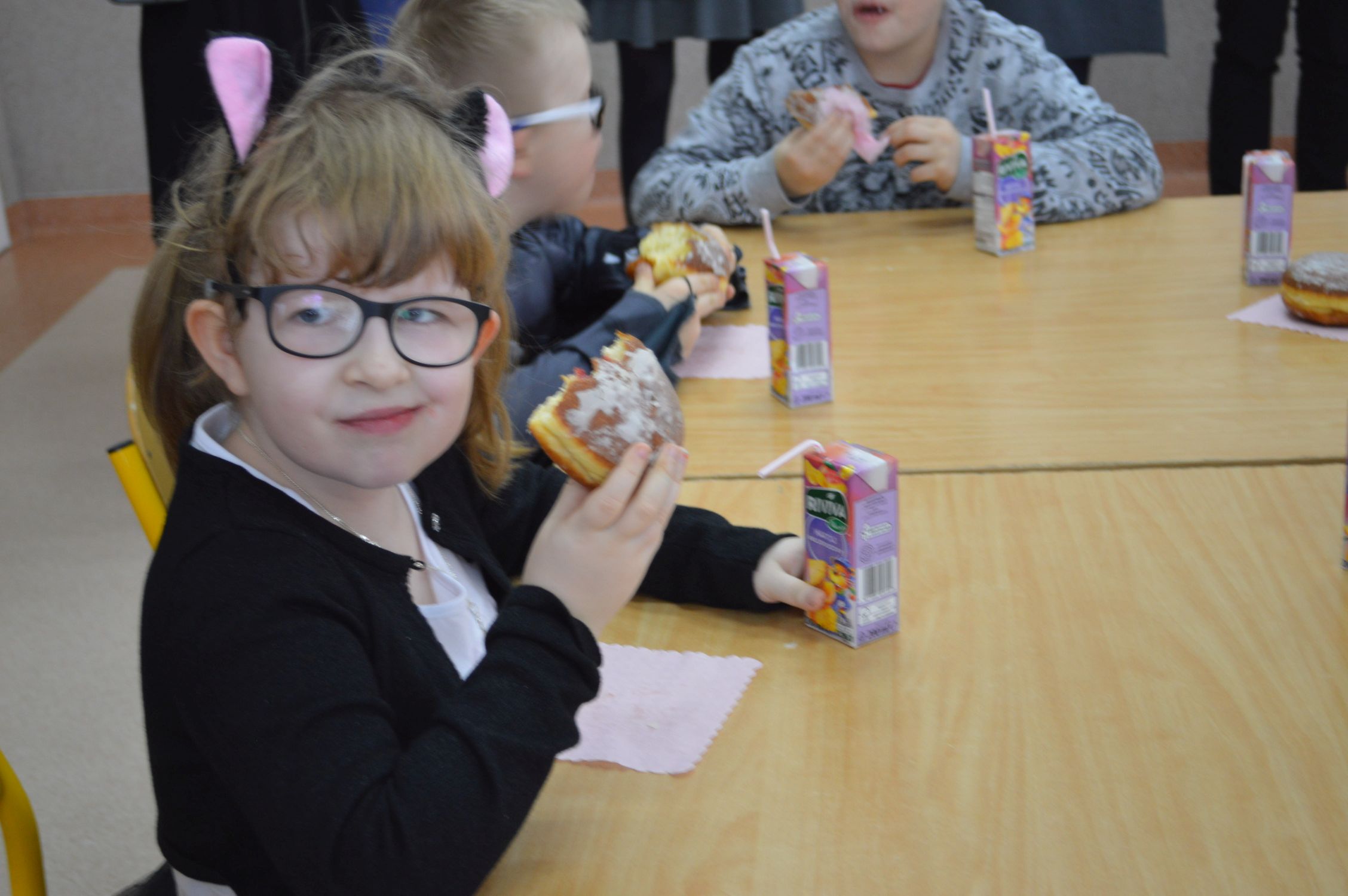W przerwie choinki, na stołówce szkolnej zorganizowano poczęstunek w postaci słodkich pączków i naturalnych soków owocowych.