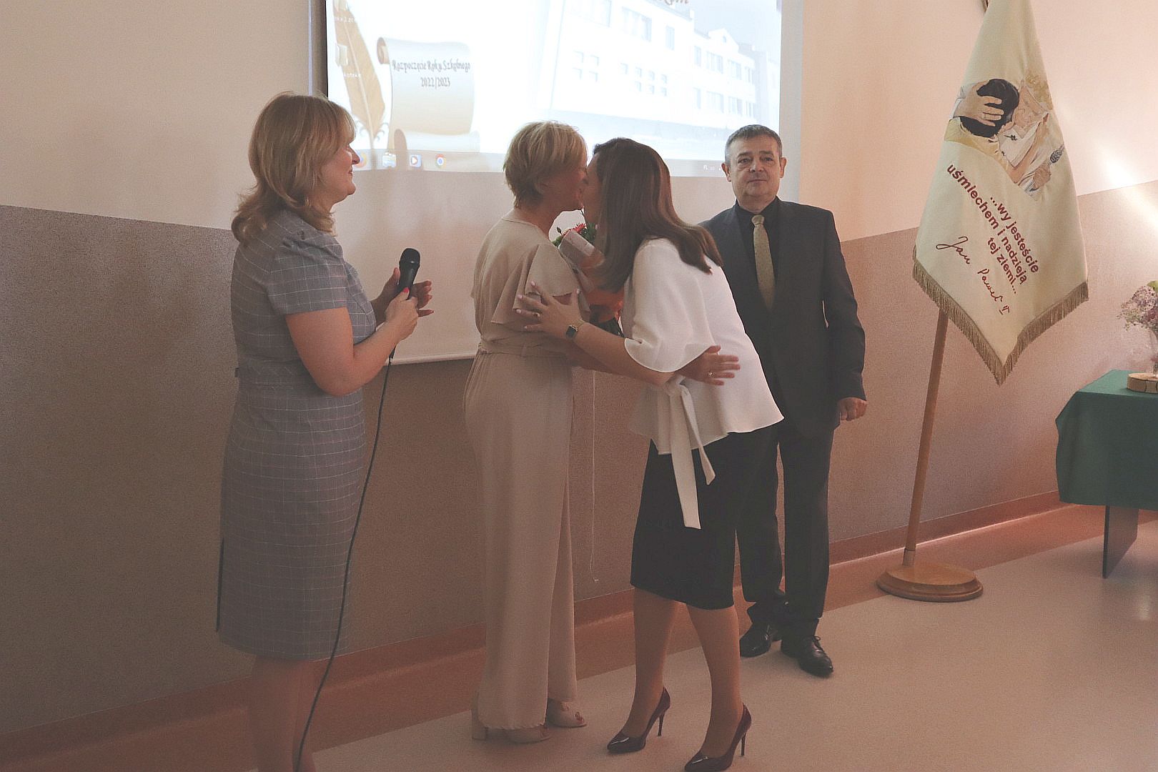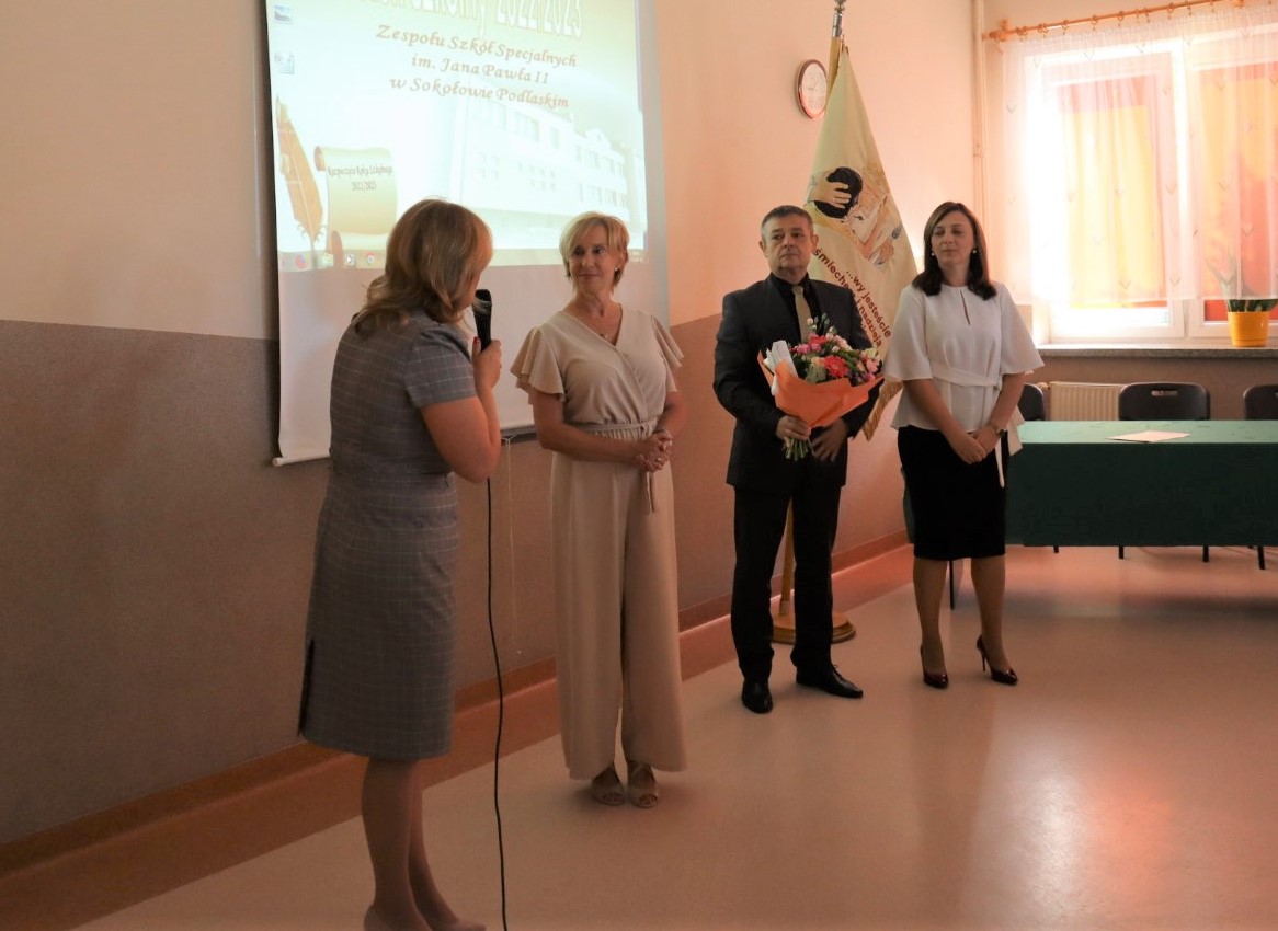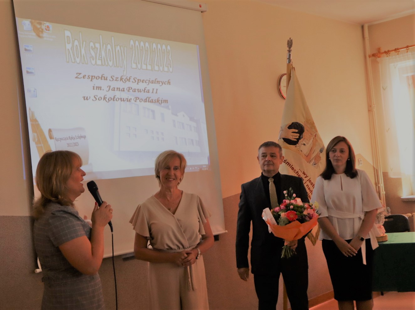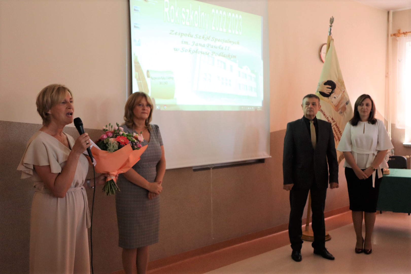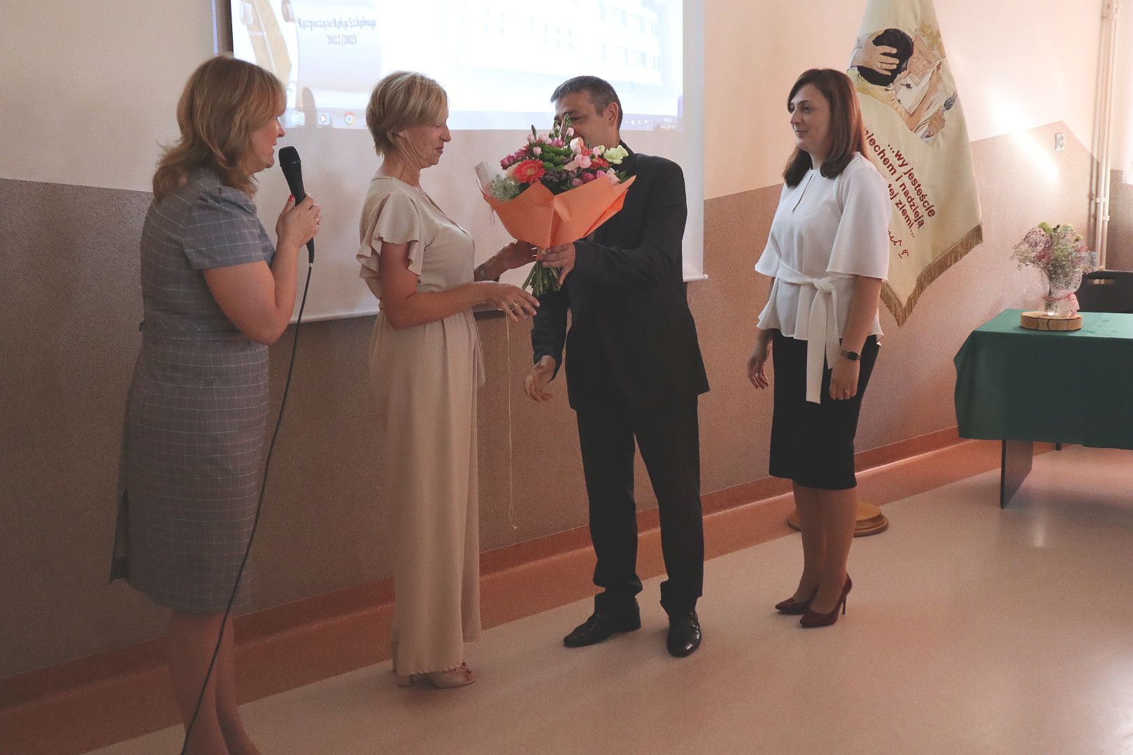 Przywitaliśmy wszystkich obecnych po przerwie wakacyjnej. Pani Dyrektor Beata Biernat zapoznała ze zmianami, które od tego roku nastąpiły. Nowymi uczniami zaopiekowali się wychowawcy. Wszystkim życzymy sukcesów i radości w nowym roku szkolnym 2022/2023, szczególnie Pani Basi Tokarskiej, która troszkę zmieniła charakter pracy. Będzie pracować tak samo dobrze jak dotychczas, tylko mniej, bo jako nauczyciel na zasłużonej emeryturze. Pani Basi podziękowała Dyrekcja, Grono, Dzieci i Rodzice – i Pani Basia podziękowała im wszystkim.