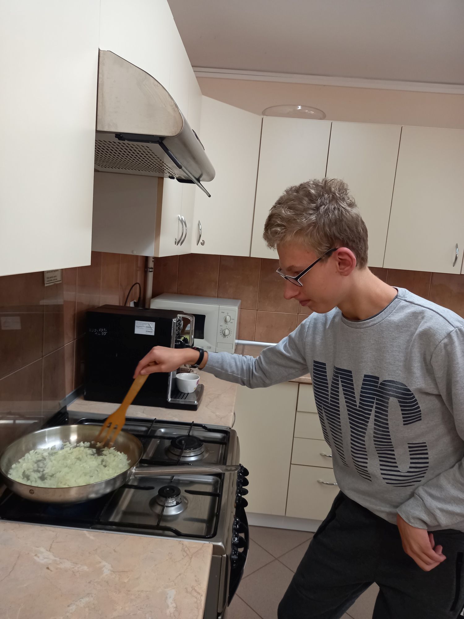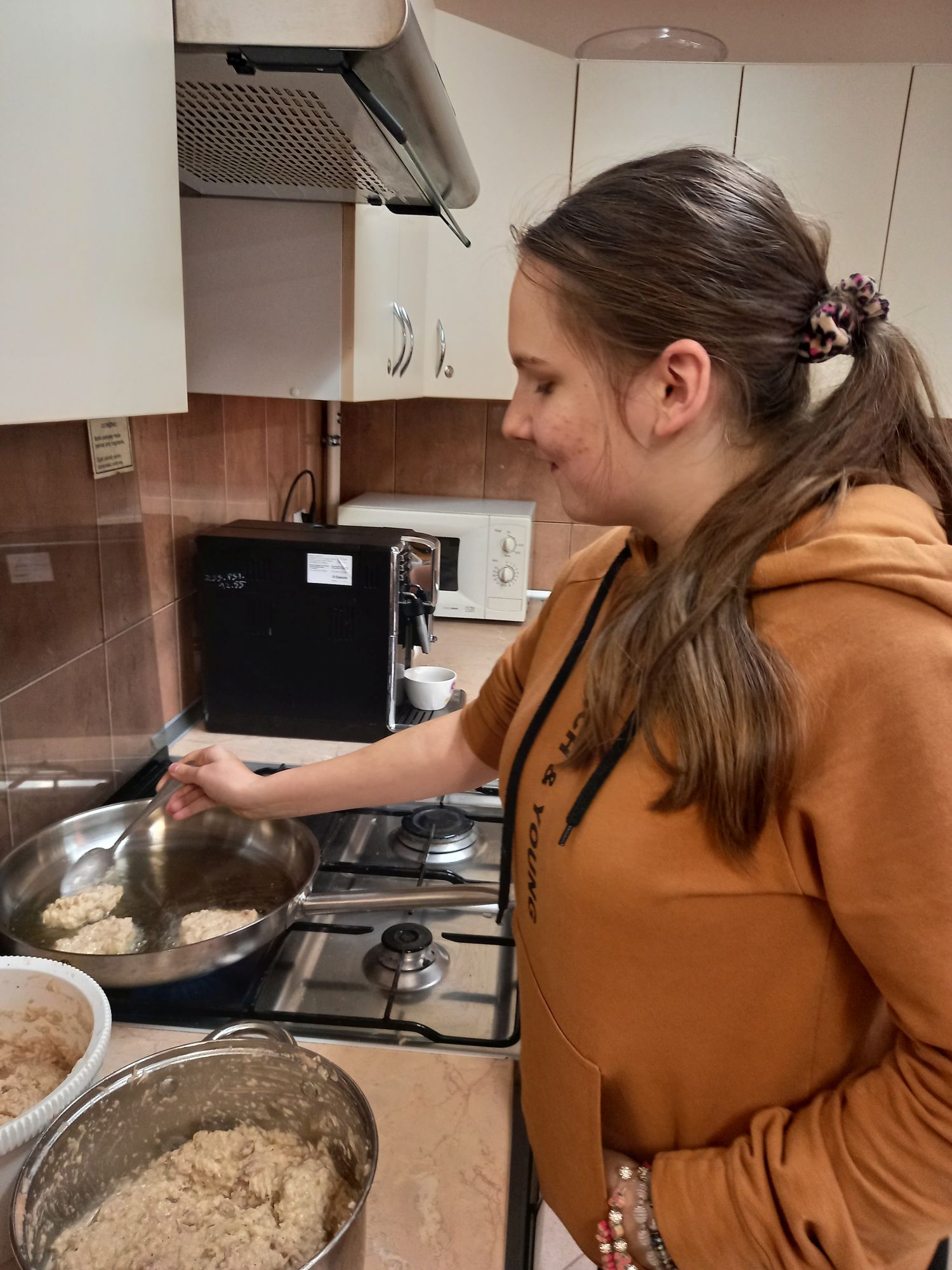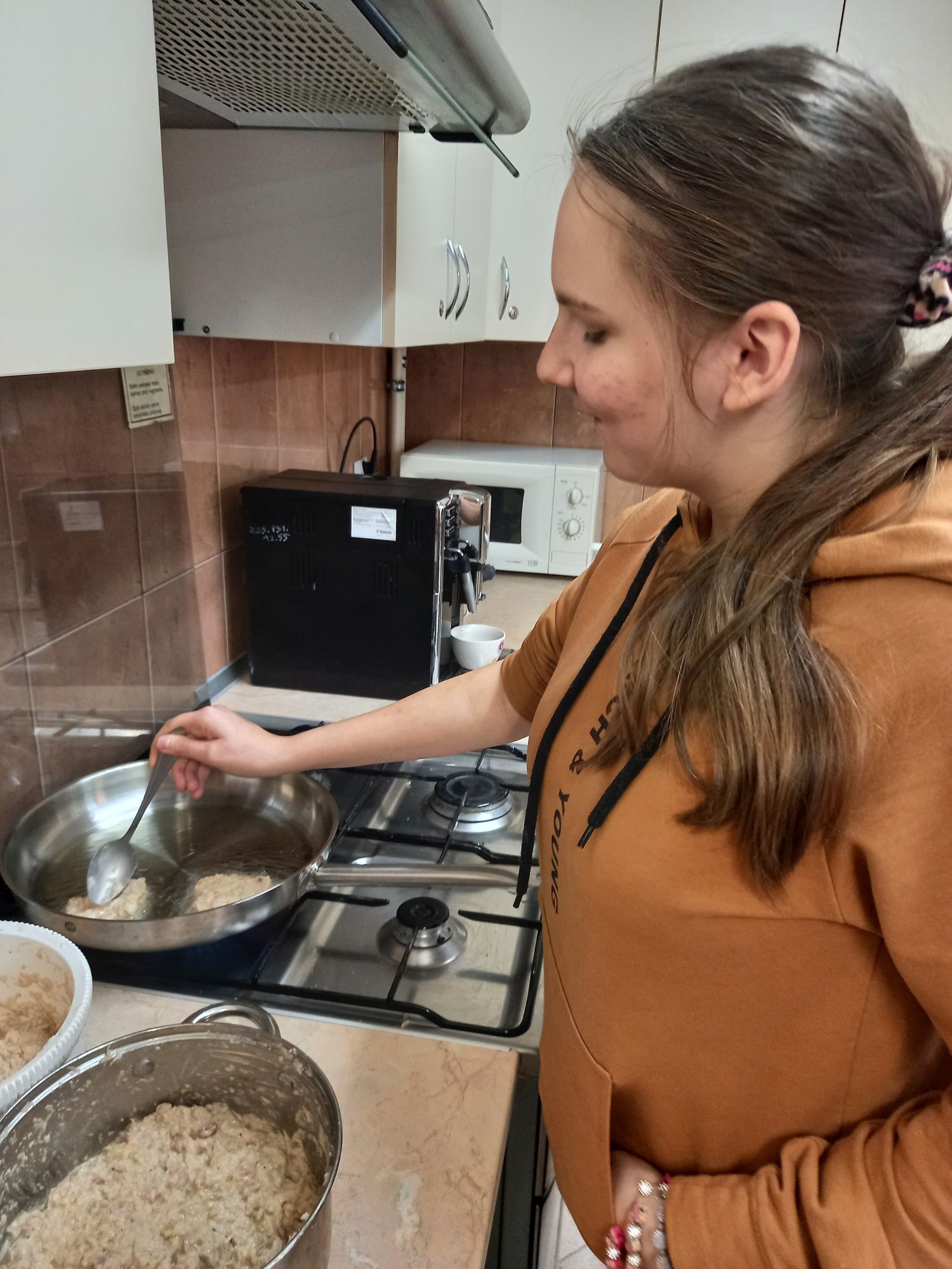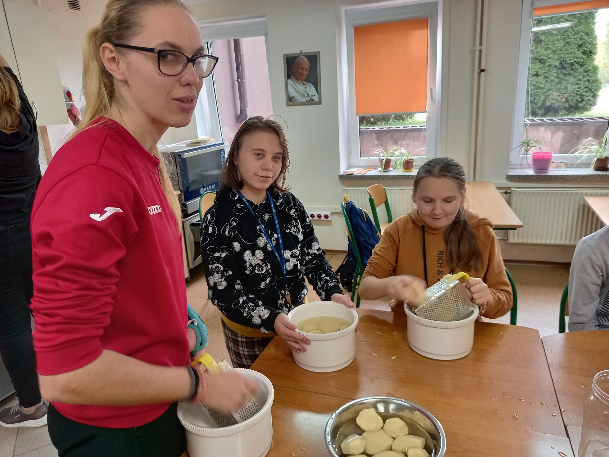 Uczennice bardzo sprawnie poradziły sobie z obieraniem oraz tarciem ziemniaków. Krojenie cebuli i boczku również nie sprawiło żadnych trudności. Wszystkim uczestnikom zajęć kulinarnych podobało się smażenie placków, ale przede wszystkim ich degustacja. 🙂