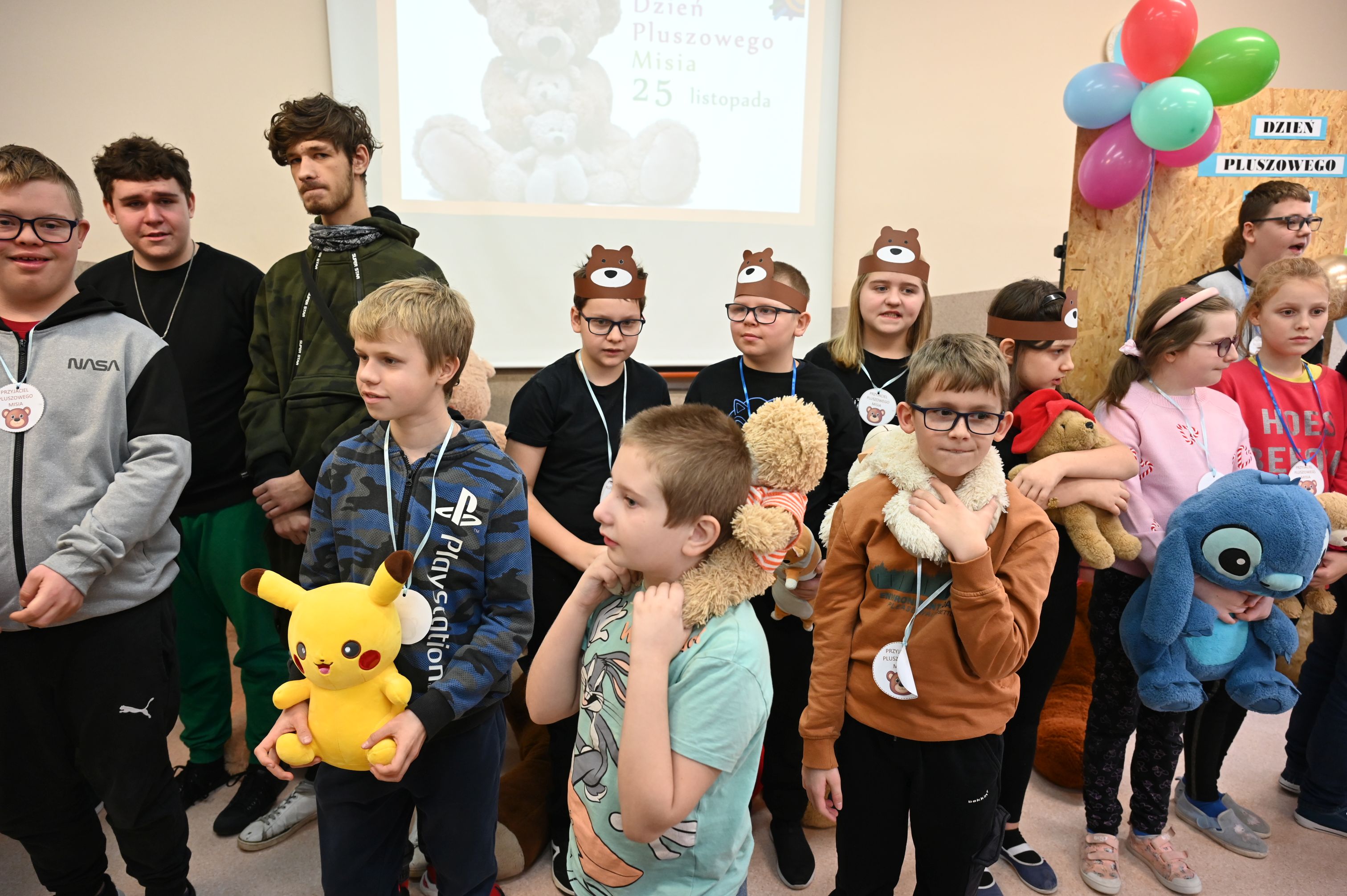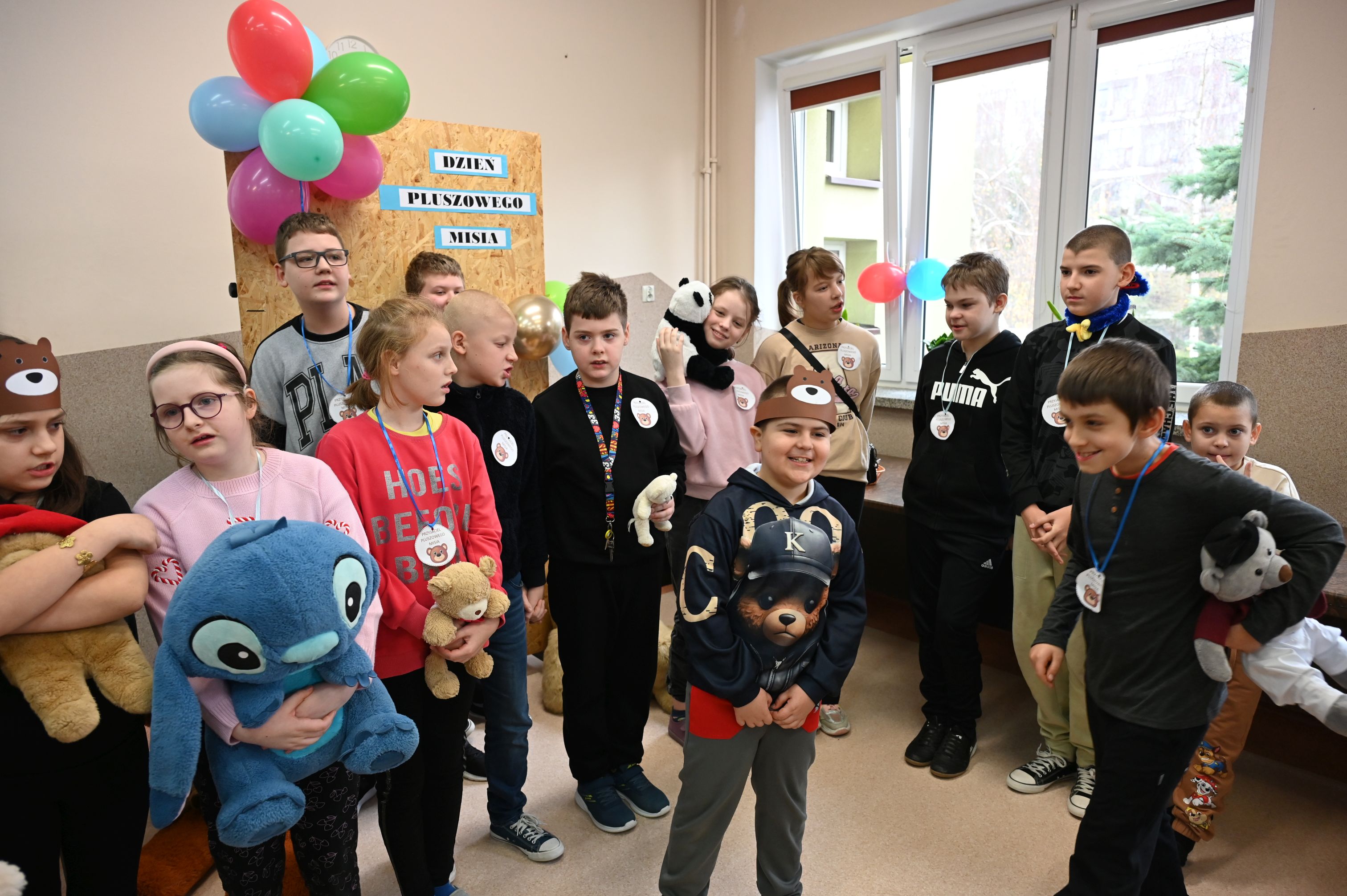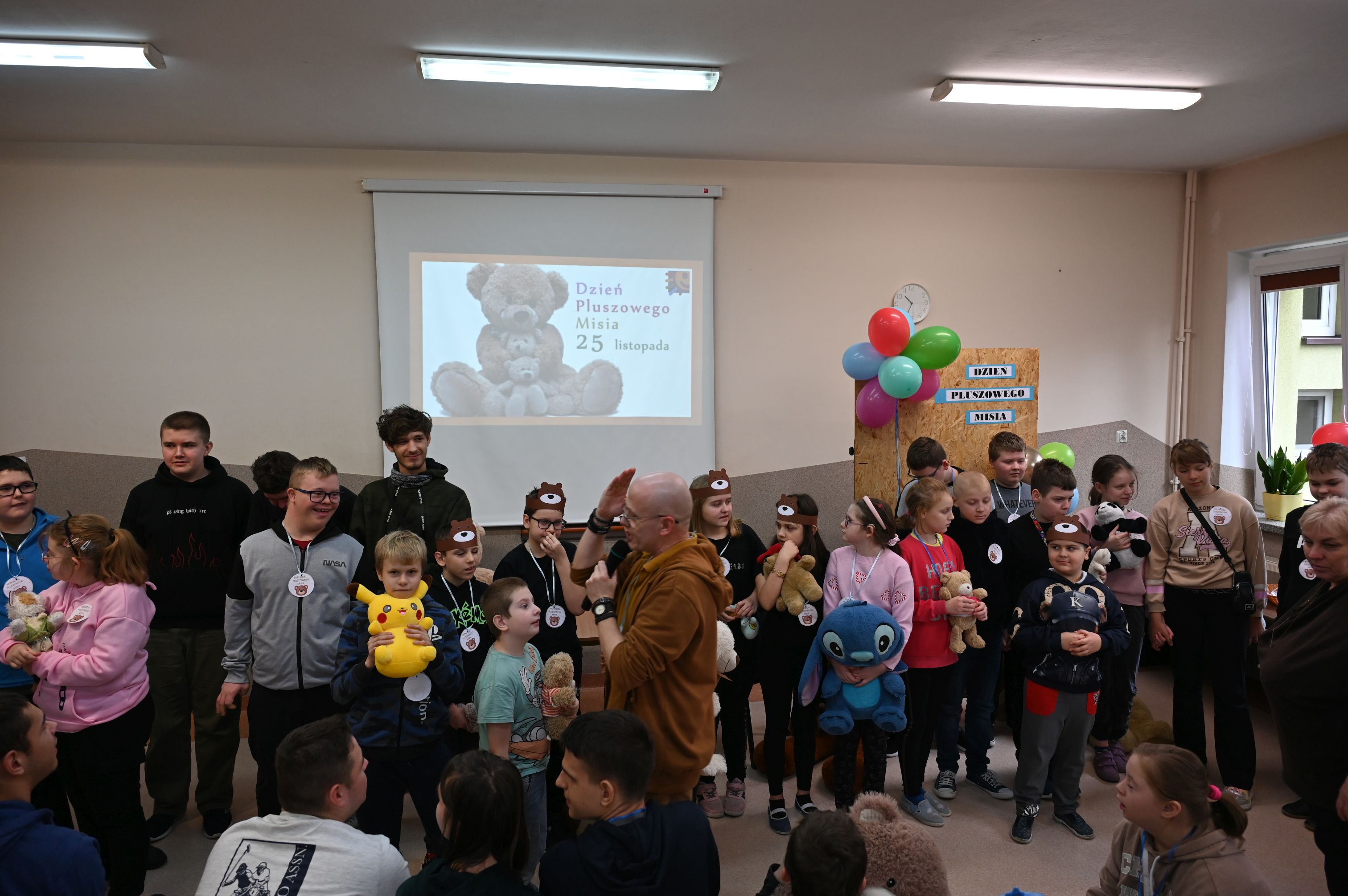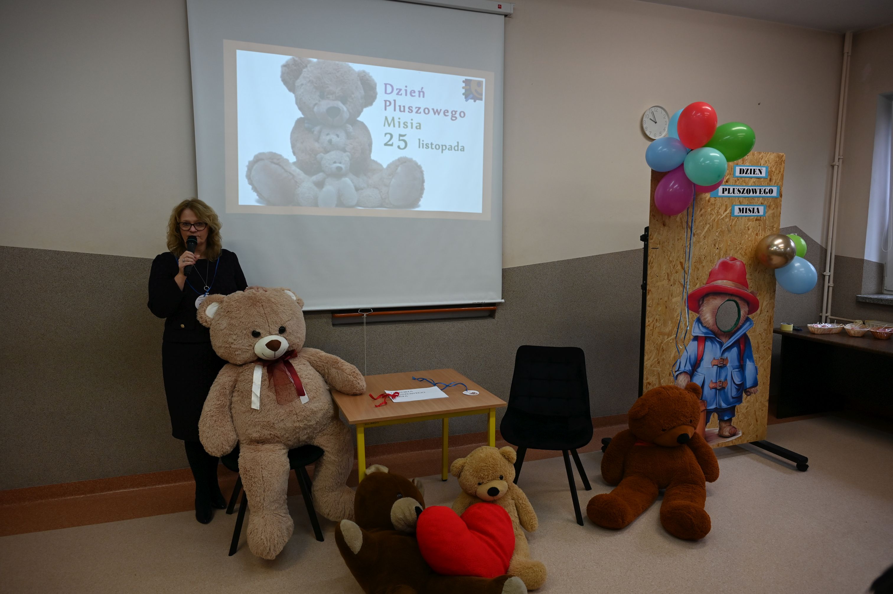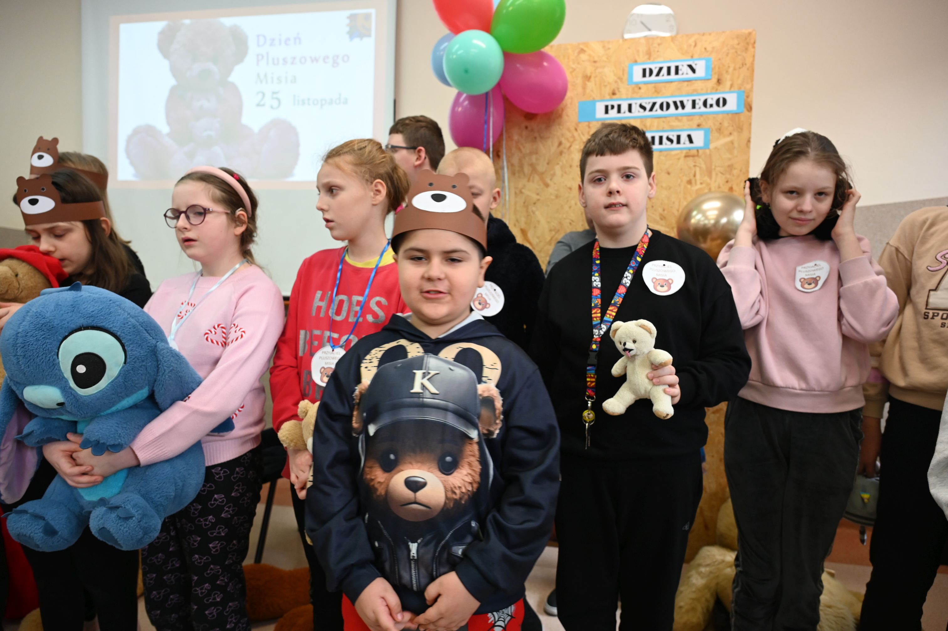 We wtorek, 25 listopada, świętowanie rozpoczęła Dyrekcja szkoły, serdecznie witając wszystkich na obchodach Międzynarodowego Dnia Pluszowego Misia. Janek przypomniał niezwykłą historię narodzin pluszowego misia, a potem zaprosiliśmy uczniów do filmowego świata Paddingtona, Colargola i Misia Uszatka. Odbył się także pokaz zdjęć z wcześniejszych obchodów Dnia Pluszowego Misia, dzięki czemu powróciły piękne i wzruszające wspomnienia. Wspólnie bawiliśmy się podczas taneczno-ruchowej zabawy „Jak obchodzić się z misiem”, która wszystkim dostarczyła mnóstwo radości. Ogromnym zainteresowaniem cieszyła się fotobudka, w której uczniowie i pracownicy szkoły mogli wykonać pamiątkowe zdjęcia ze swoimi pluszowymi przyjaciółmi. A na przyjęciu u misia oczywiście nie mogło zabraknąć chlebka z miodkiem – ulubionego przysmaku każdego misia! Każde dziecko otrzymało dziś pamiątkowy medal „Zostań przyjacielem pluszowego misia” oraz słodką niespodziankę – lizaka-misia. Na zakończenie dyrekcja podziękowała za przygotowanie tego wyjątkowego dnia bibliotece szkolnej, samorządowi uczniowskiemu oraz naszemu niezastąpionemu konferansjerowi, panu Grzegorzowi – nauczycielowi muzyki. To był wyjątkowy, magiczny dzień, który na długo pozostanie w naszej pamięci!