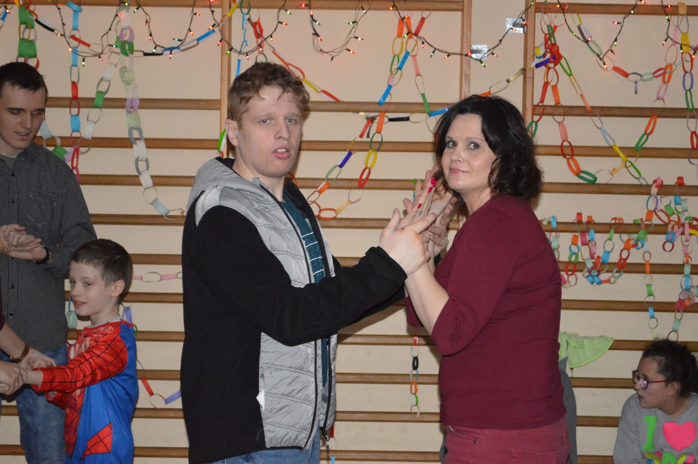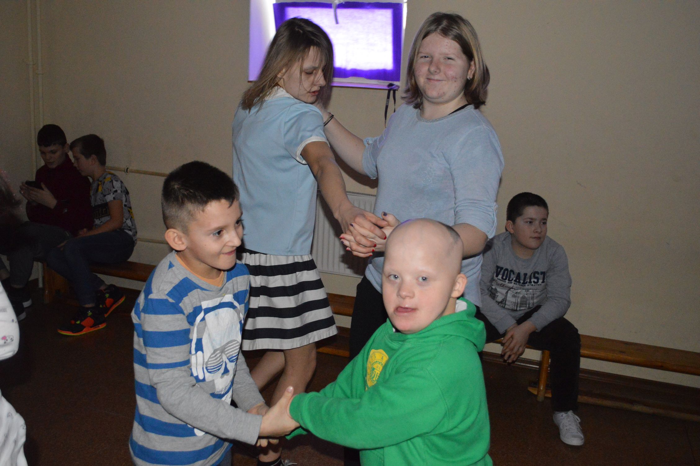 Zostaliśmy serdecznie powitani przez Dyrektora szkoły i organizatorów. Spotkanie rozpoczęły zabawy relaksacyjne i wspólne śpiewanie kolęd przy akompaniamencie ks. Arbaszewskiego.