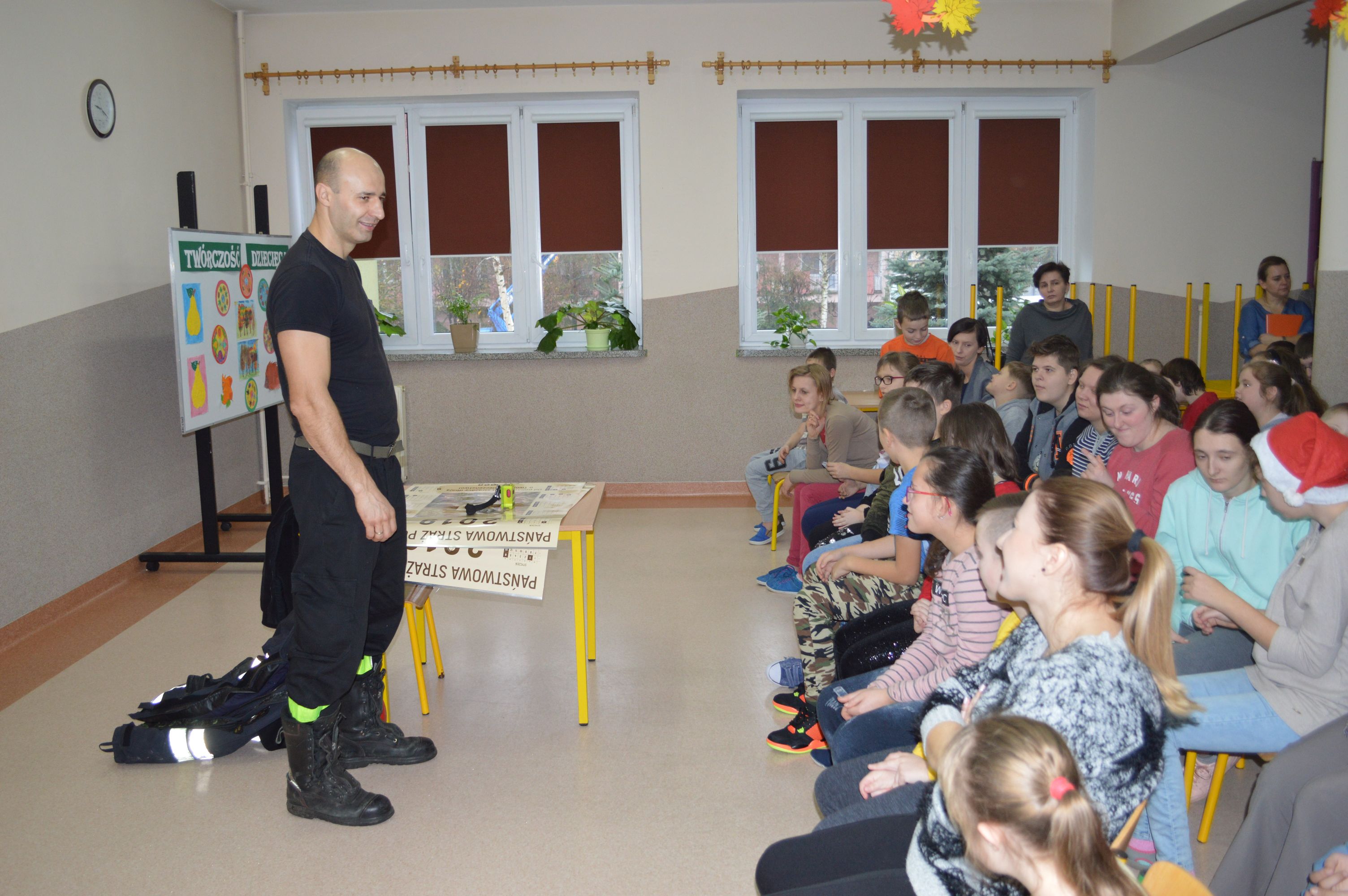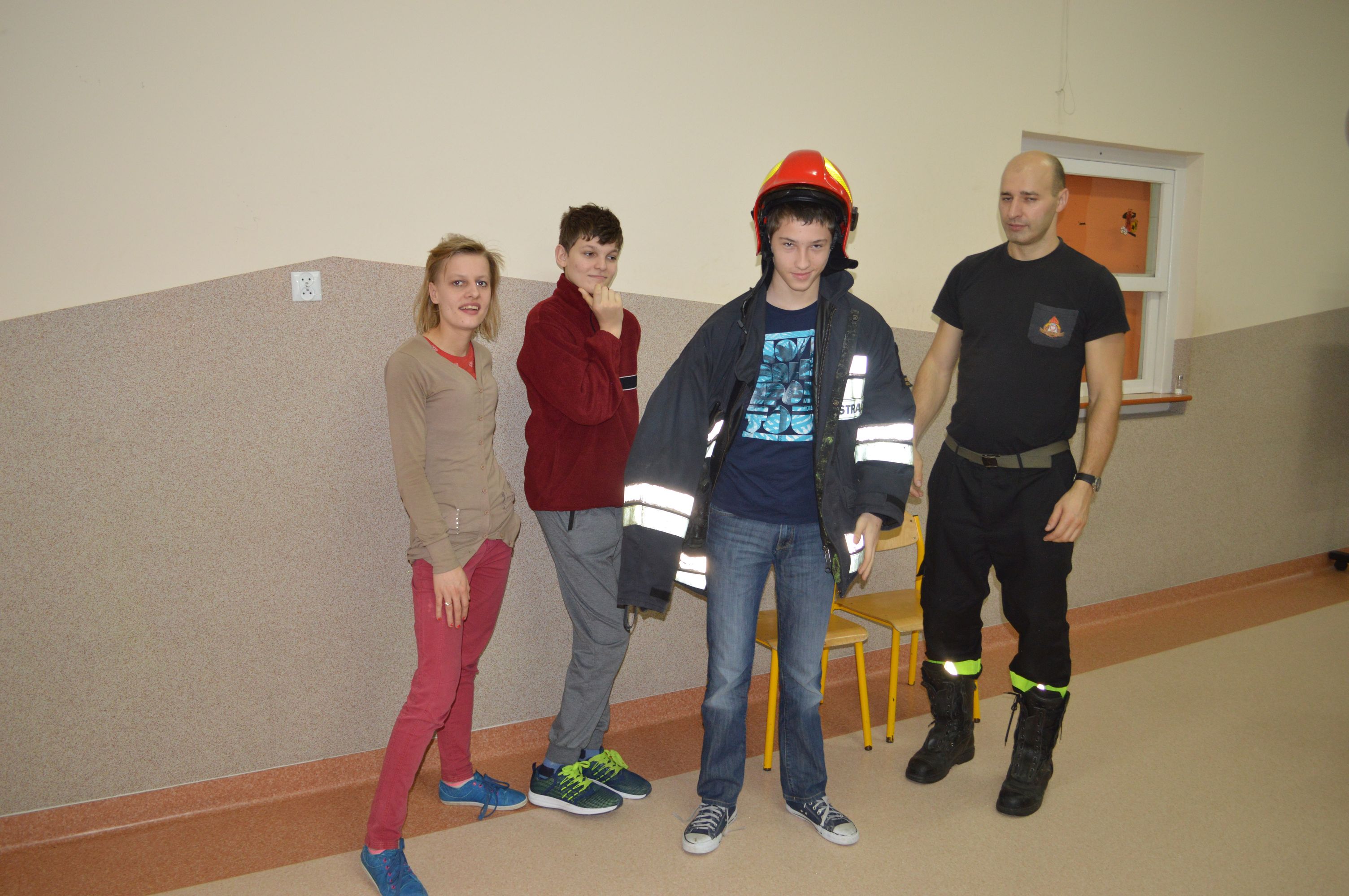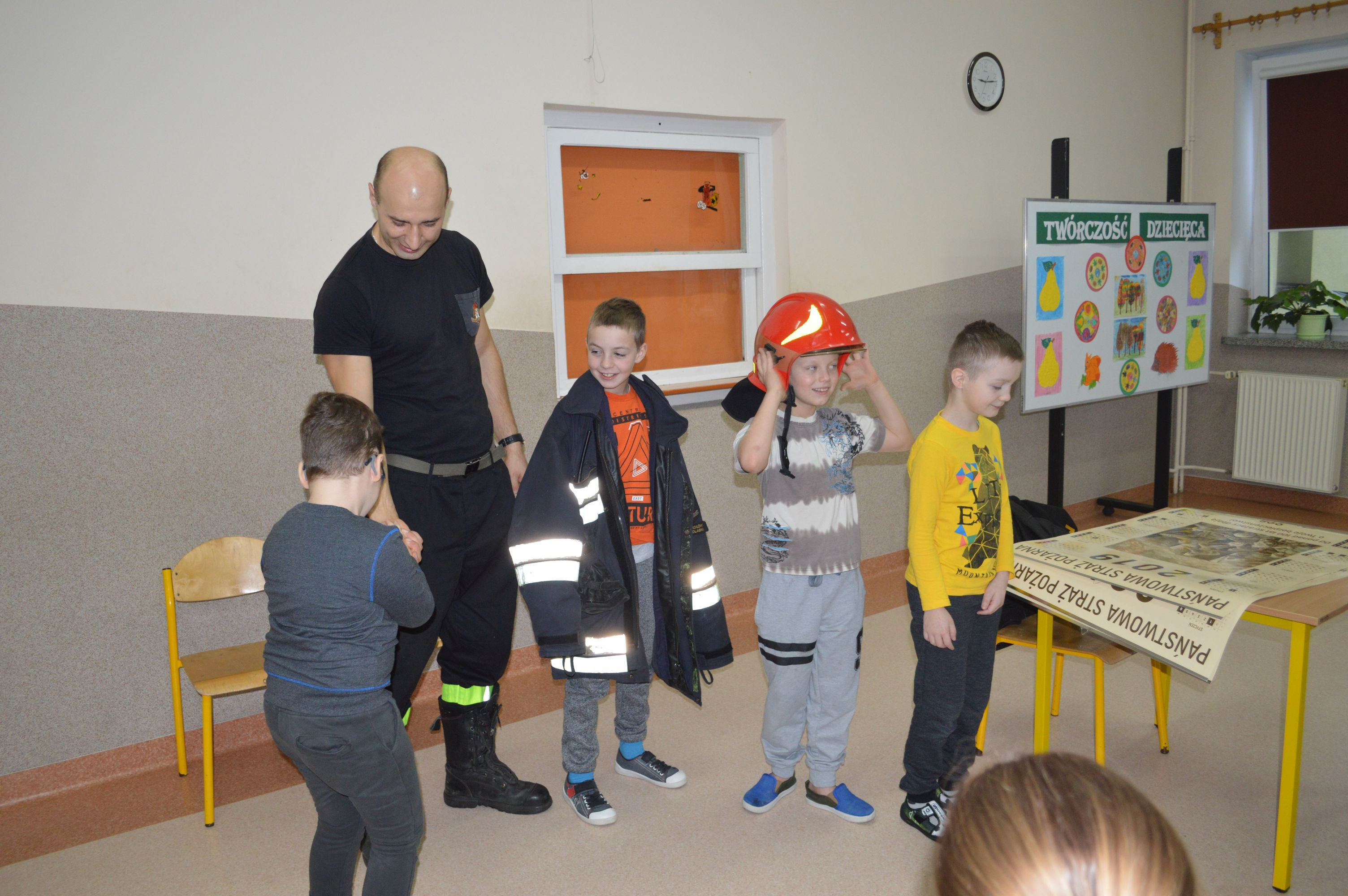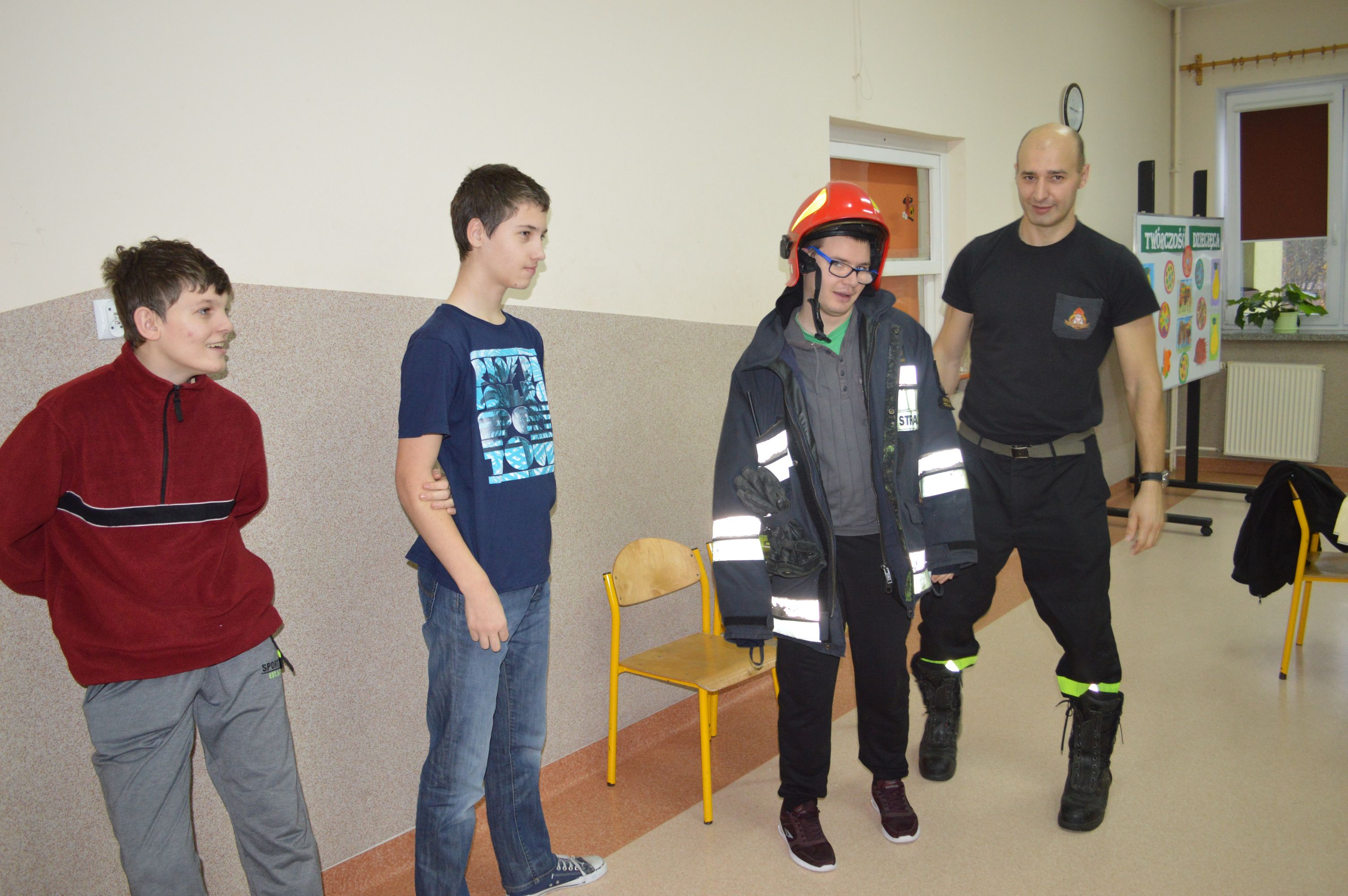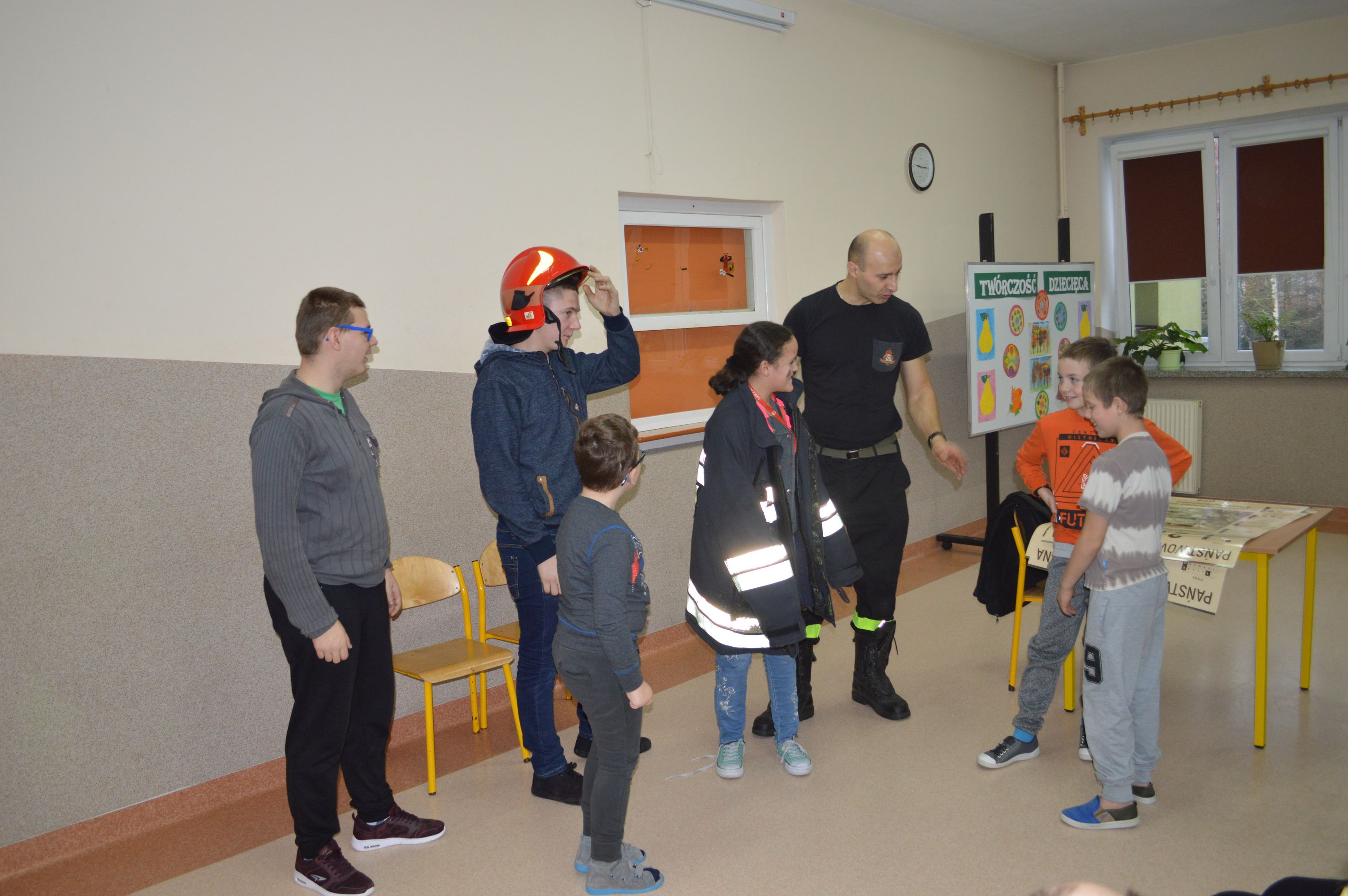 W ramach profilaktyki i prewencji gościliśmy Panów strażaków z Państwowej Straży Pożarnej w Sokołowie Podlaskim. Pan Marcin Tomczuk, starszy kapitan, poprowadził pogadankę na temat bezpieczeństwa oraz uczulił na unikanie niebezpiecznych zachowań podczas zbliżających się dni wolnych – świąt i ferii zimowych. Nasi uczniowie z uwagą wysłuchali porad i chętnie przymierzali strażacki ekwipunek.