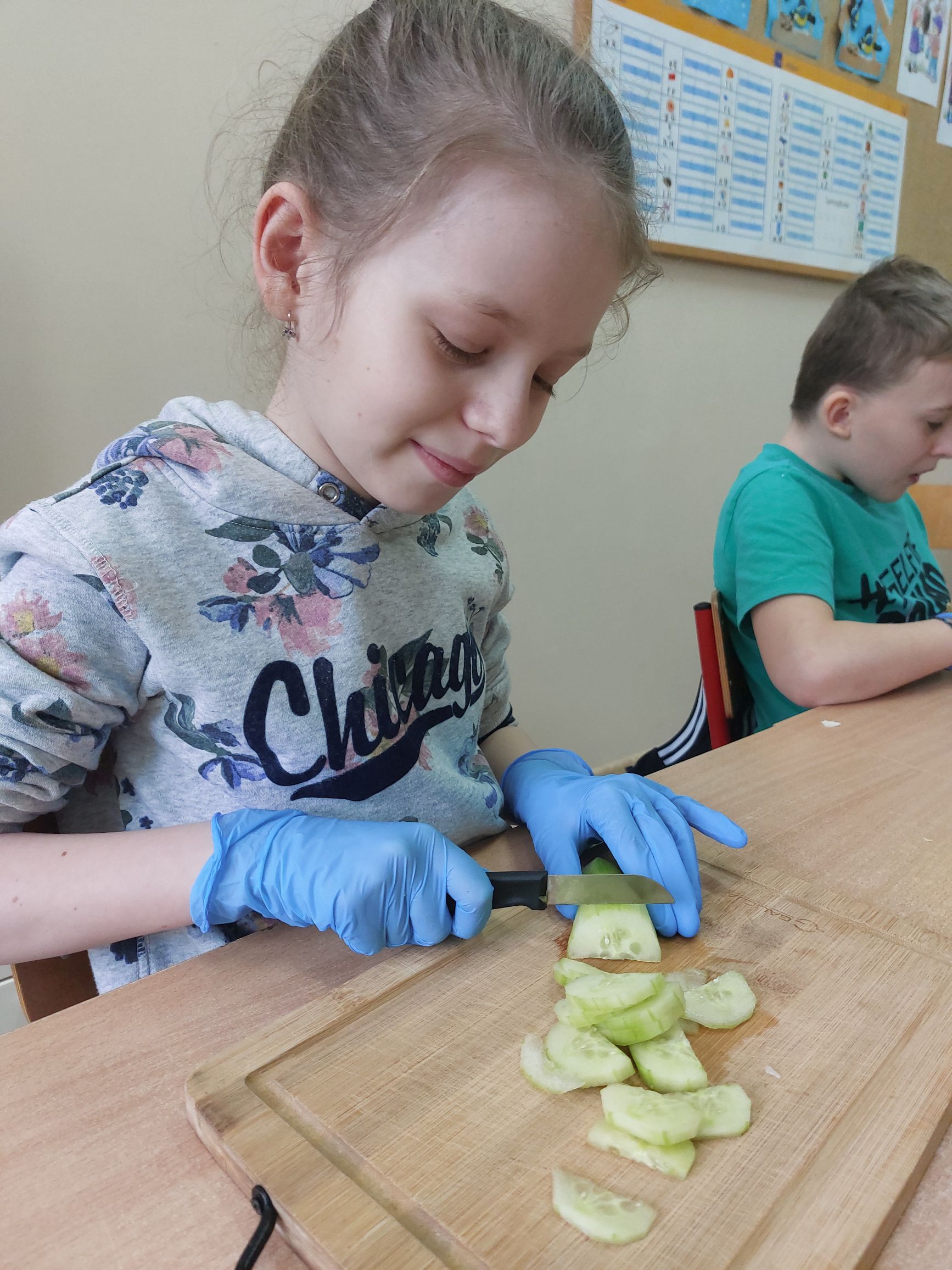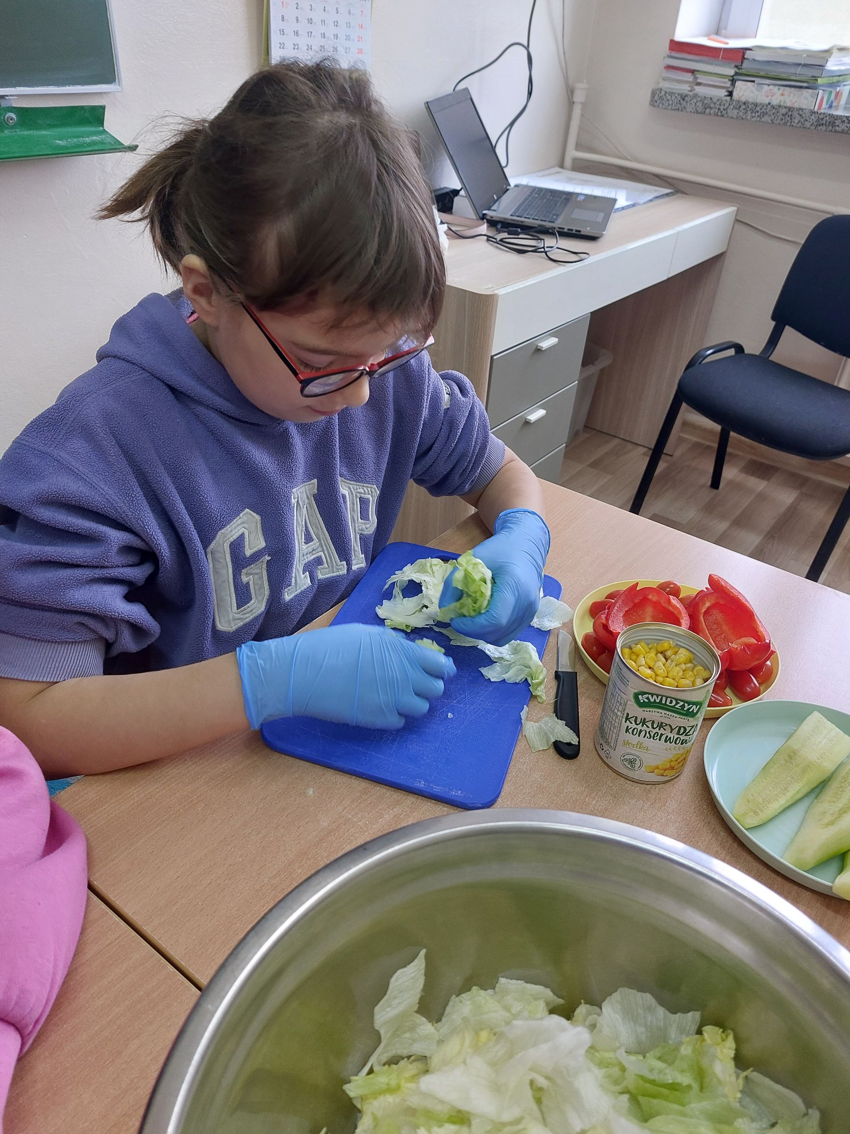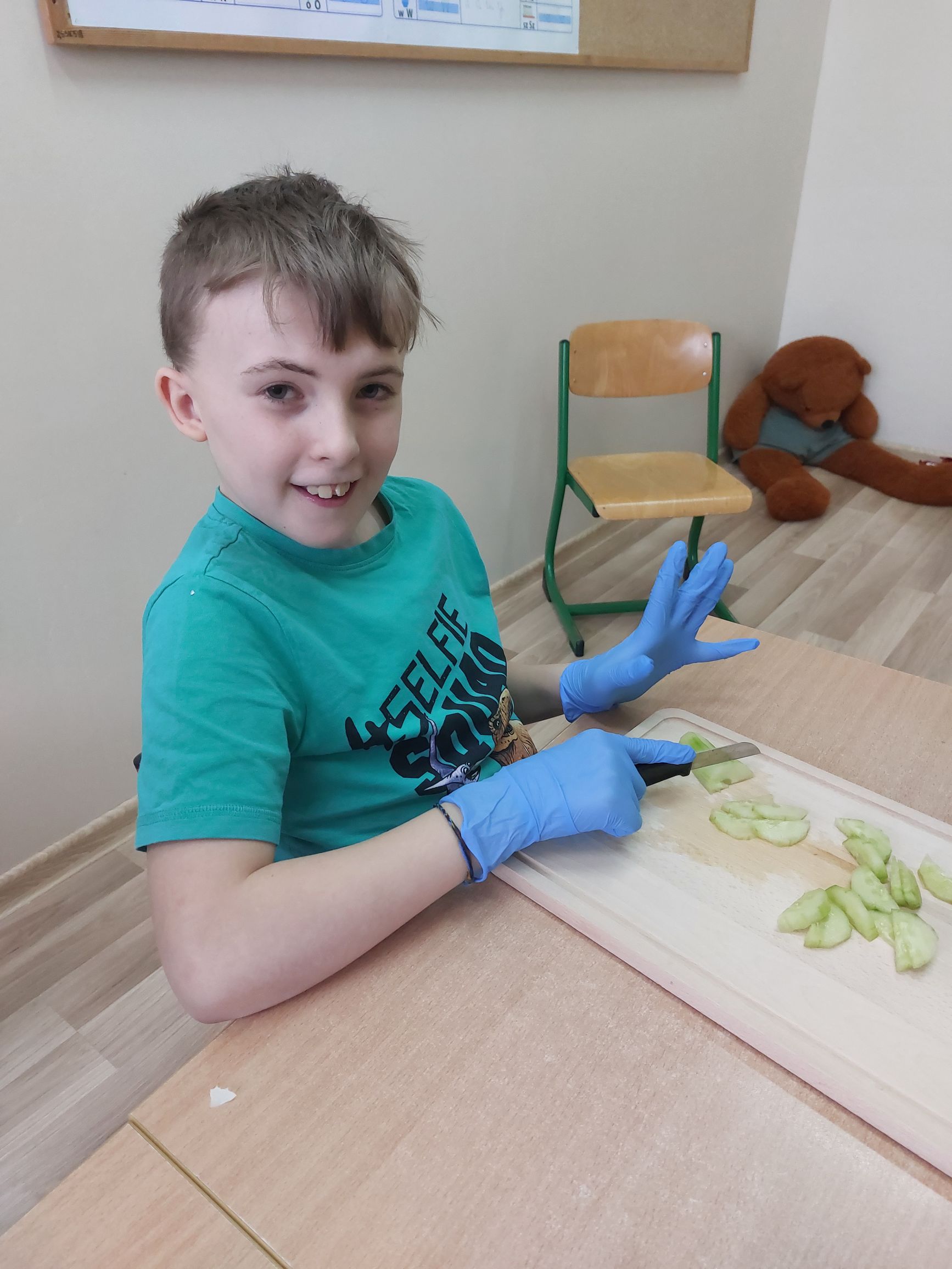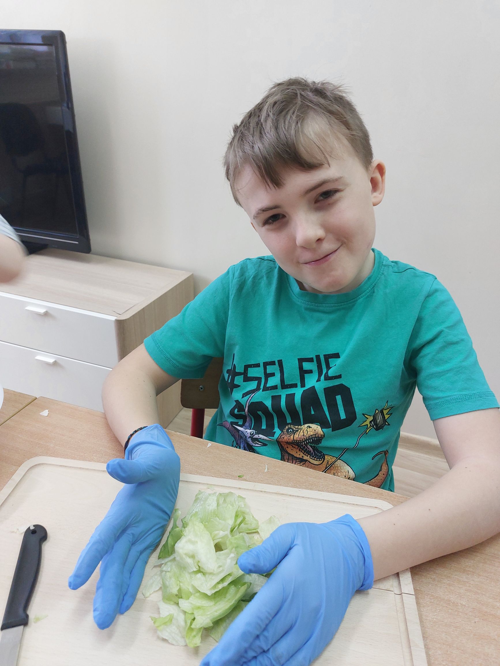 Uczniowie klasy IIIc postanowili przygotować sałatkę warzywną. Przygotowaliśmy potrzebne produkty, dostaliśmy deski oraz nożyki i tak przystąpiliśmy do krojenia. Samodzielnie kroiliśmy i przyrządzaliśmy sałatkę warzywną, przestrzegając zasad bezpieczeństwa i higieny. Wykazaliśmy się dużym zaangażowaniem i zapałem do pracy. Dało nam to dużo satysfakcji. Na koniec gotową sałatkę nałożyliśmy na talerze urządzając w sali prawdziwą ucztę! Było tak pysznie, że postanowiliśmy się tym podzielić z innymi.
