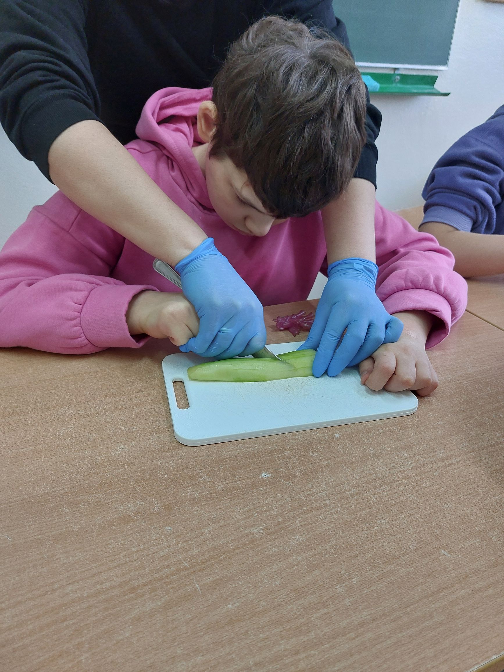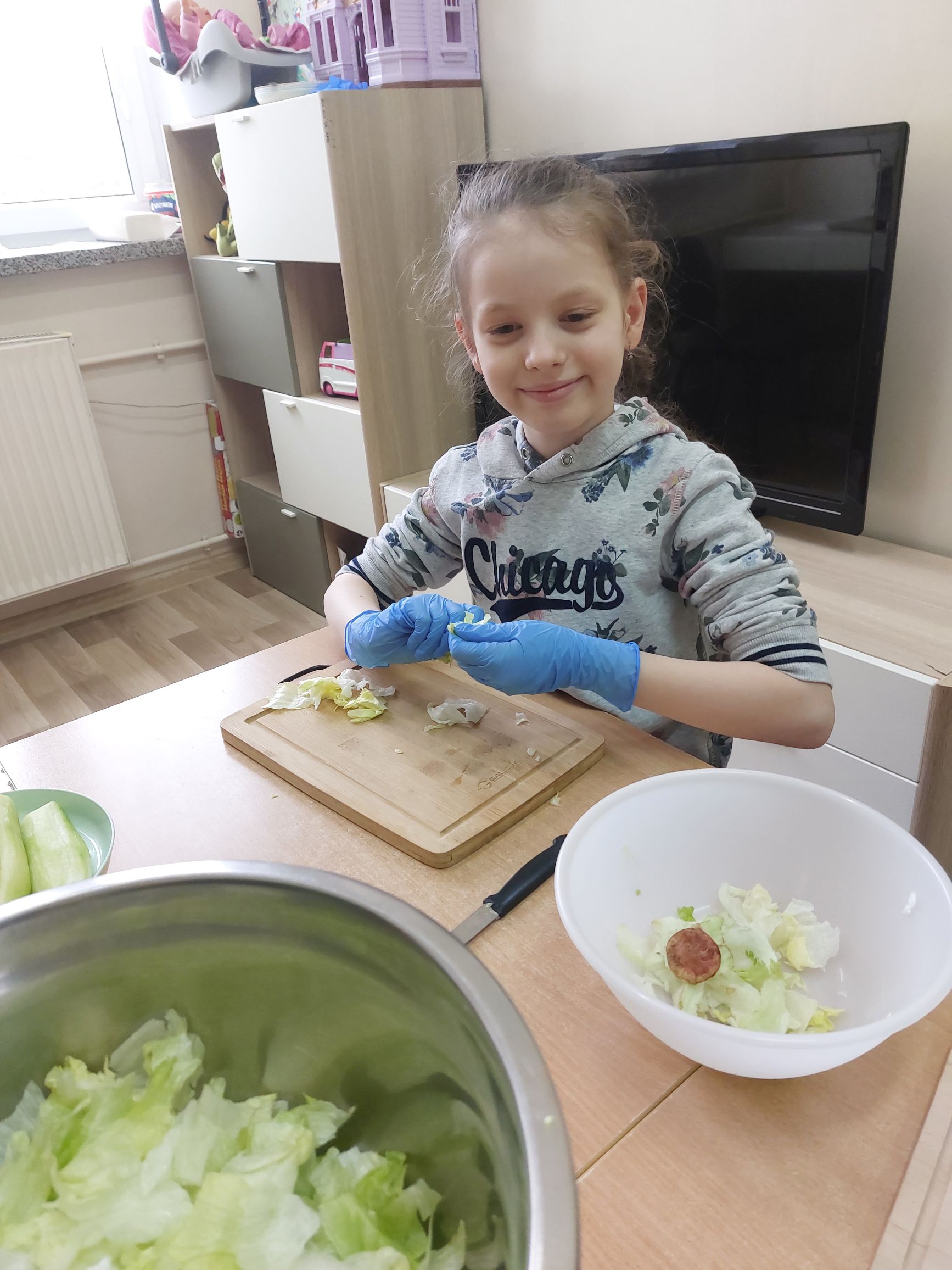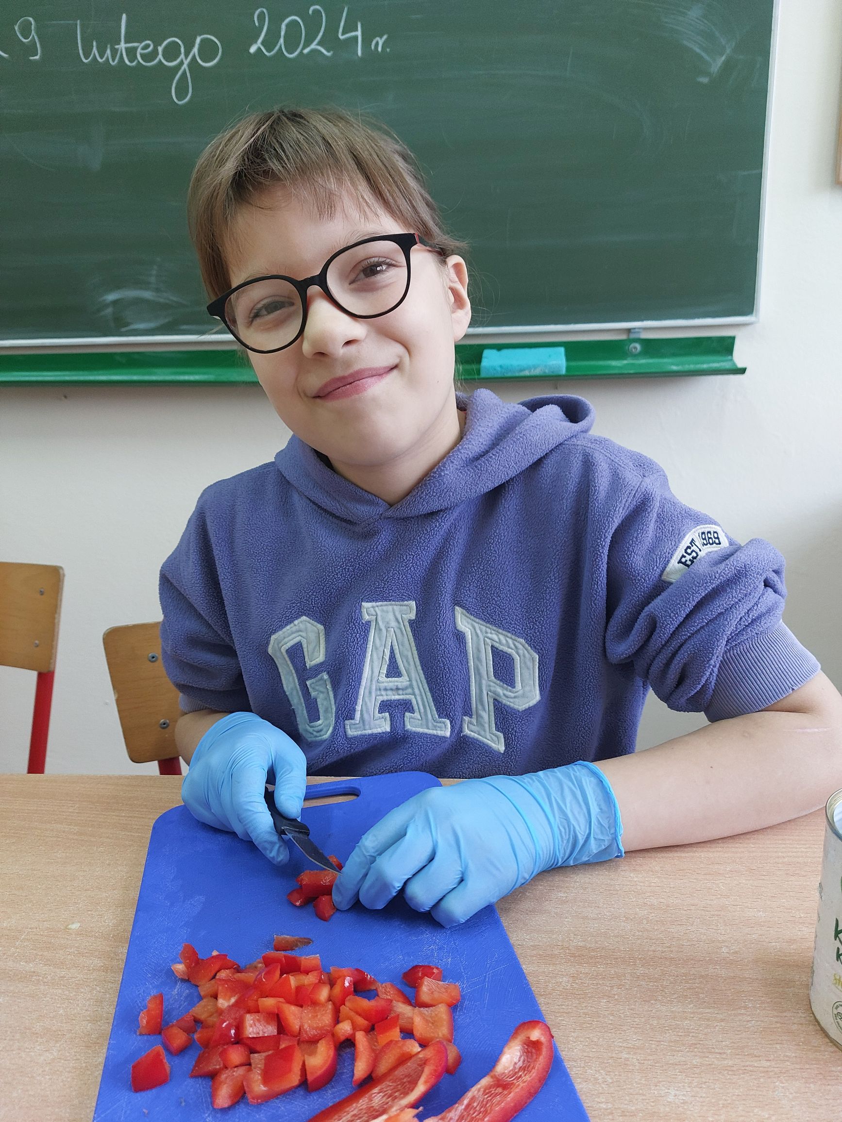 Uczniowie klasy IIIc postanowili przygotować sałatkę warzywną. Przygotowaliśmy potrzebne produkty, dostaliśmy deski oraz nożyki i tak przystąpiliśmy do krojenia. Samodzielnie kroiliśmy i przyrządzaliśmy sałatkę warzywną, przestrzegając zasad bezpieczeństwa i higieny. Wykazaliśmy się dużym zaangażowaniem i zapałem do pracy. Dało nam to dużo satysfakcji. Na koniec gotową sałatkę nałożyliśmy na talerze urządzając w sali prawdziwą ucztę! Było tak pysznie, że postanowiliśmy się tym podzielić z innymi.