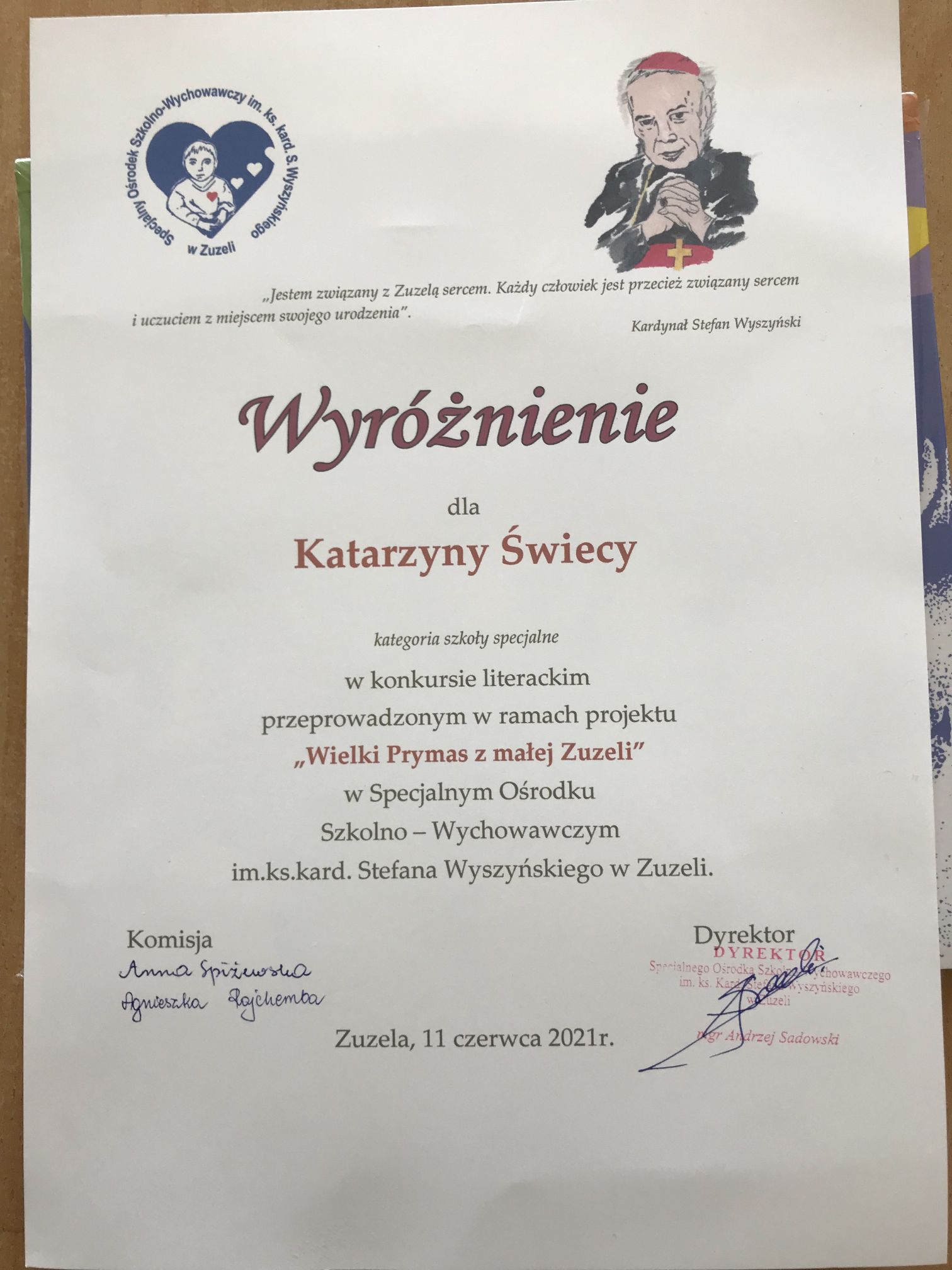 Uczniowie naszej szkoły Kuba Majchrzyk i Katarzyna Świeca brali udział w konkursie literackim pt.” Wielki Prymas z małej Zuzeli” organizowanym przez Specjalny Ośrodek Szkolno-Wychowawczy im. Ks. Kard. Stefana Wyszyńskiego w Zuzeli. Katarzyna Świeca otrzymała wyróżnienie w swojej kategorii. Gratulujemy i życzymy dalszych sukcesów.