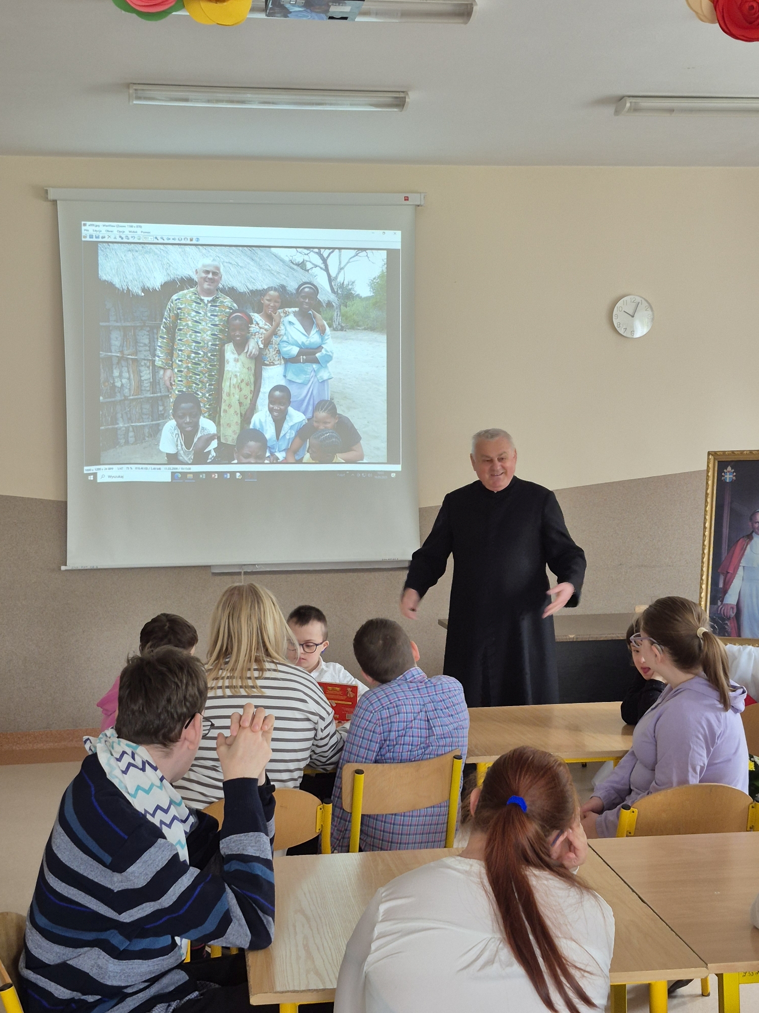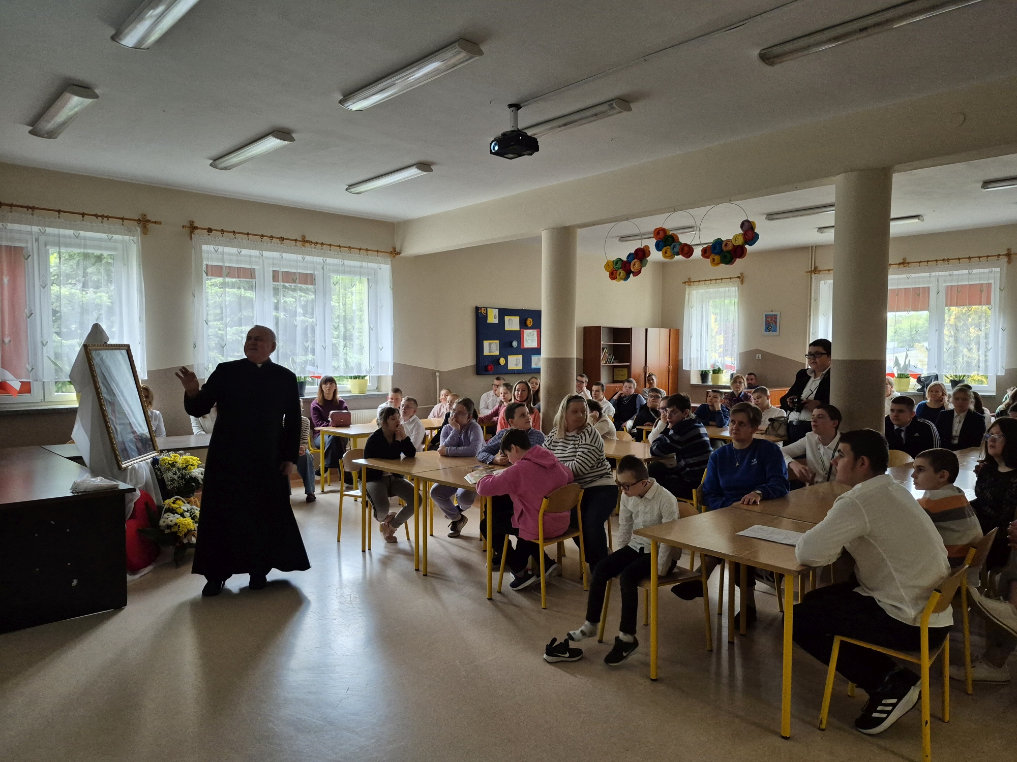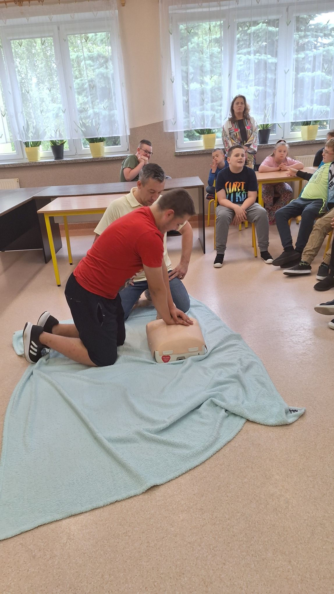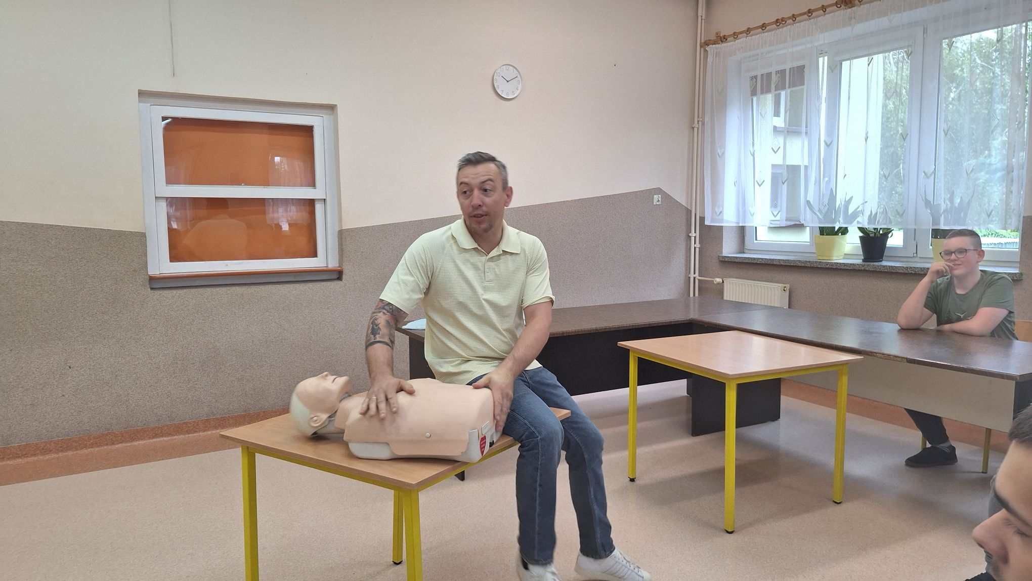 Nauczyciel edukacji dla bezpieczeństwa p. I. Ratyński przypomniał uczniom podstawowe zasady udzielania pierwszej pomocy: sprawdzenie przytomności i oddechu poszkodowanego, układanie osoby nieprzytomnej w pozycji bocznej ustalonej, podstawy resuscytacji krążeniowo-oddechowej (RKO) – pokaz demonstracyjny, udzielanie pomocy w przypadku skaleczeń, oparzeń i ukąszeń.
