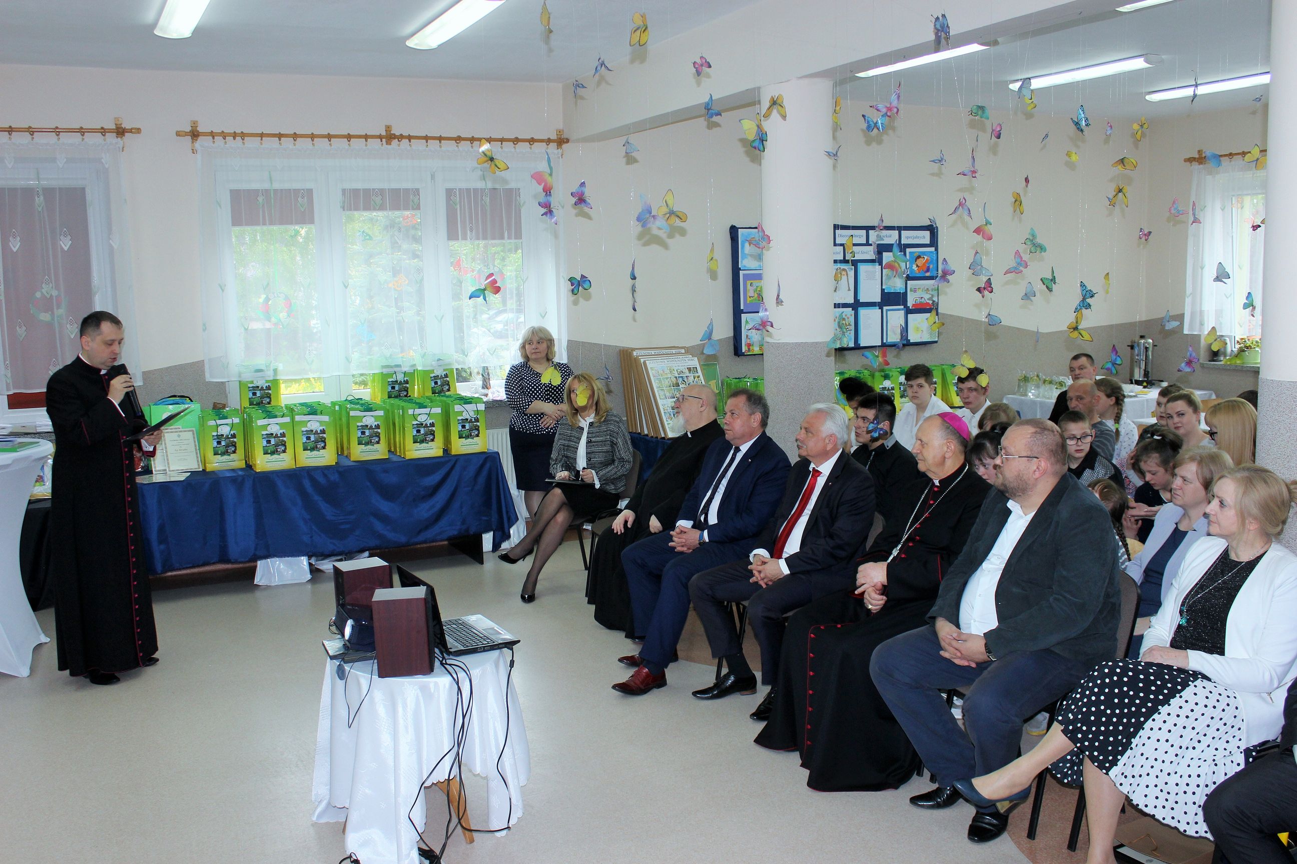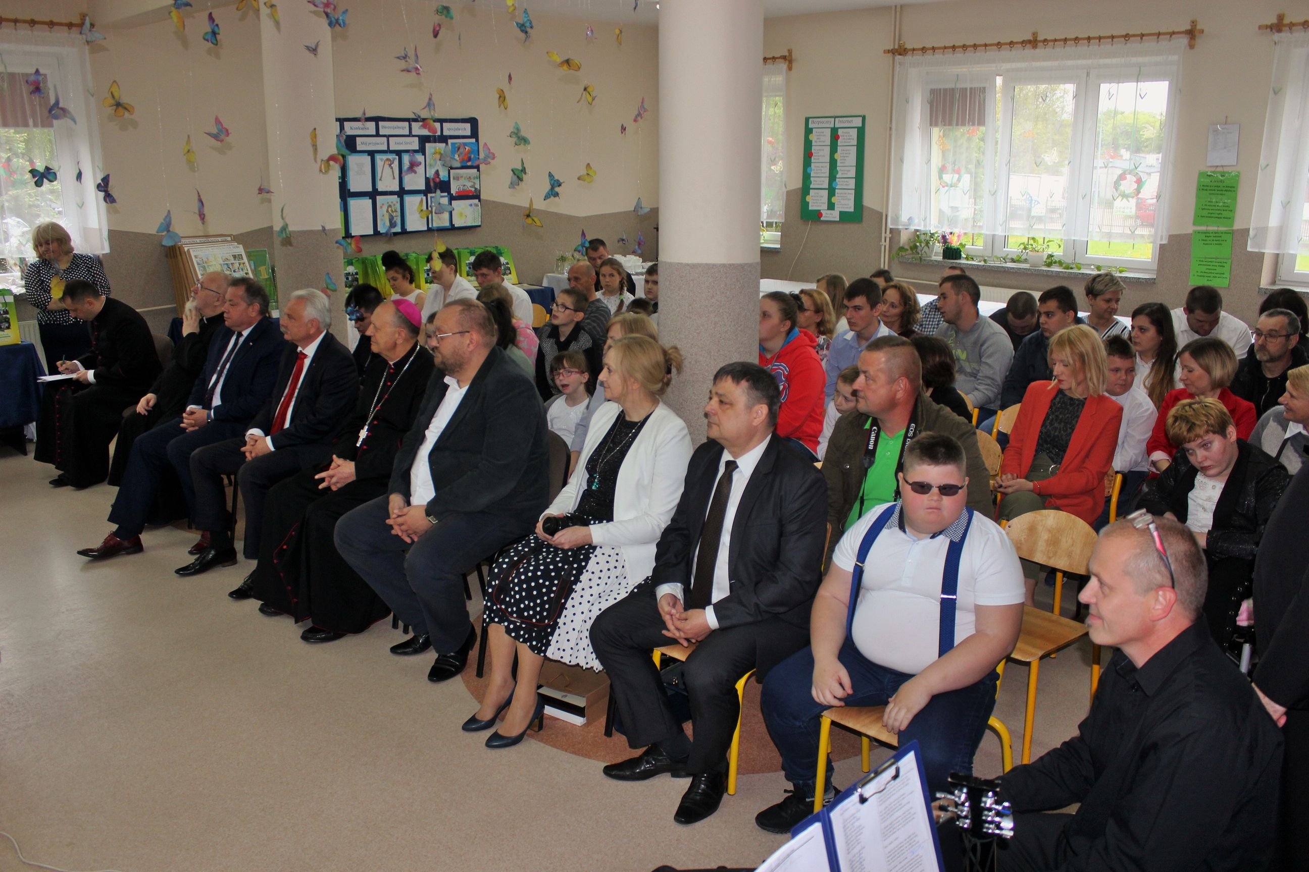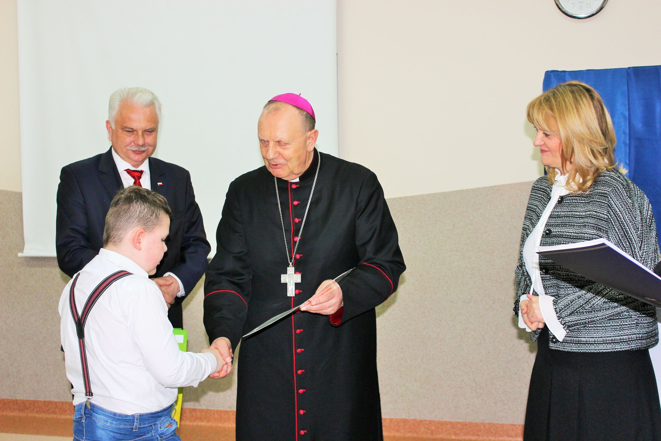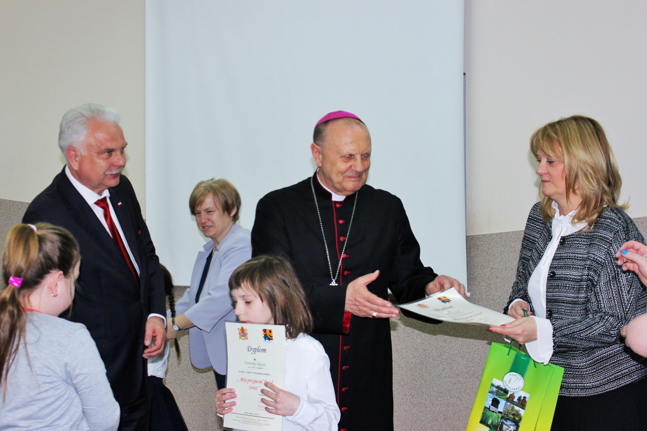 We wtorek, 14 maja 2019 r. w Zespole Szkół Specjalnych im. Jana Pawła II w Sokołowie Podlaskim odbyło się uroczyste rozstrzygnięcie i podsumowanie konkursu diecezjalnego „Mój przyjaciel Anioł Stróż„. To już VI edycja konkursów dla dzieci i młodzieży szkół specjalnych z terenu diecezji drohiczyńskiej. Rekordowa liczba nadesłanych prac z terenu trzech województw świadczy o rosnącym zainteresowaniu i popularności konkursu wśród placówek oświatowych i wychowawczych. Uroczystość poprowadzili Pani Dyrektor Beata Biernat i ks.kan dr Krzysztof Mielnicki jako przedstawiciele organizatorów konkursu – Zespołu Szkół Specjalnych im. Jana Pawła II w Sokołowie Podlaskim i Wydziału Katechezy i Szkolnictwa Katolickiego Diecezji Drohiczyńskiej. Podczas uroczystego wręczania nagród obecni byli : J.e. ks. prof. dr hab. Tadeusz Pikus Ordynariusz Diecezji Drohiczyńskiej, ks. kan. dr Krzysztof Mielnicki Dyrektor Wydziału Katechezy i Szkolnictwa Katolickiego, ks. Marcin Gołębiewski Dyrektor Centrum Informacji Diecezji Drohiczyńskiej, ks. Leszek Ruciński przedstawiciel Parafii Św. Jana Bosko w Sokołowie Podlaskim, Senator RP Waldemar Kraska, Pan Adam Skup Dyrektor Siedleckiej Delegatury Kuratorium Oświaty w Warszawie, Pan Jacek Odziemczyk Przewodniczący Rady Powiatu Sokołowskiego, Pani Joanna Malinowska Dyrektor Biura Senatora RP Waldemara Kraski oraz Pani Beata Biernat Dyrektor Zespołu Szkół Specjalnych im. Jana Pawła II w Sokołowie Podlaskim. Uroczystość uświetnił występ naszych uczniów -„artystów”, których przygotowali Pan Grzegorz Nowotniak, Pani Dorota Prokopczuk, Pani Aneta Nowotniak, Pani Renata Krasowska i Pani Małgorzata Dąbrowiecka. Osobami odpowiedzialnymi za przebieg konkursu były katechetki: Pani Urszula Krzymowska i Pani Grażyna Jarosz. Fotorelację przygotowała Pani Katarzyna Zalewska.