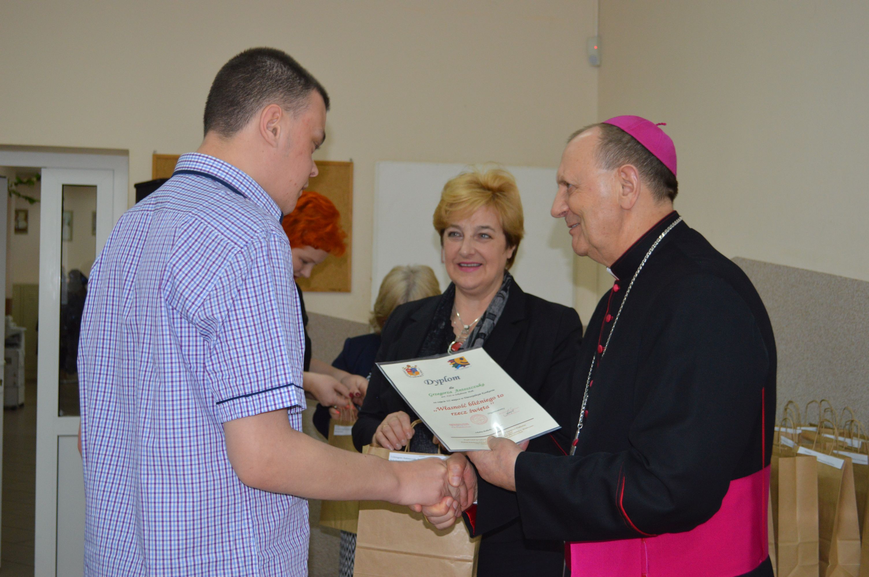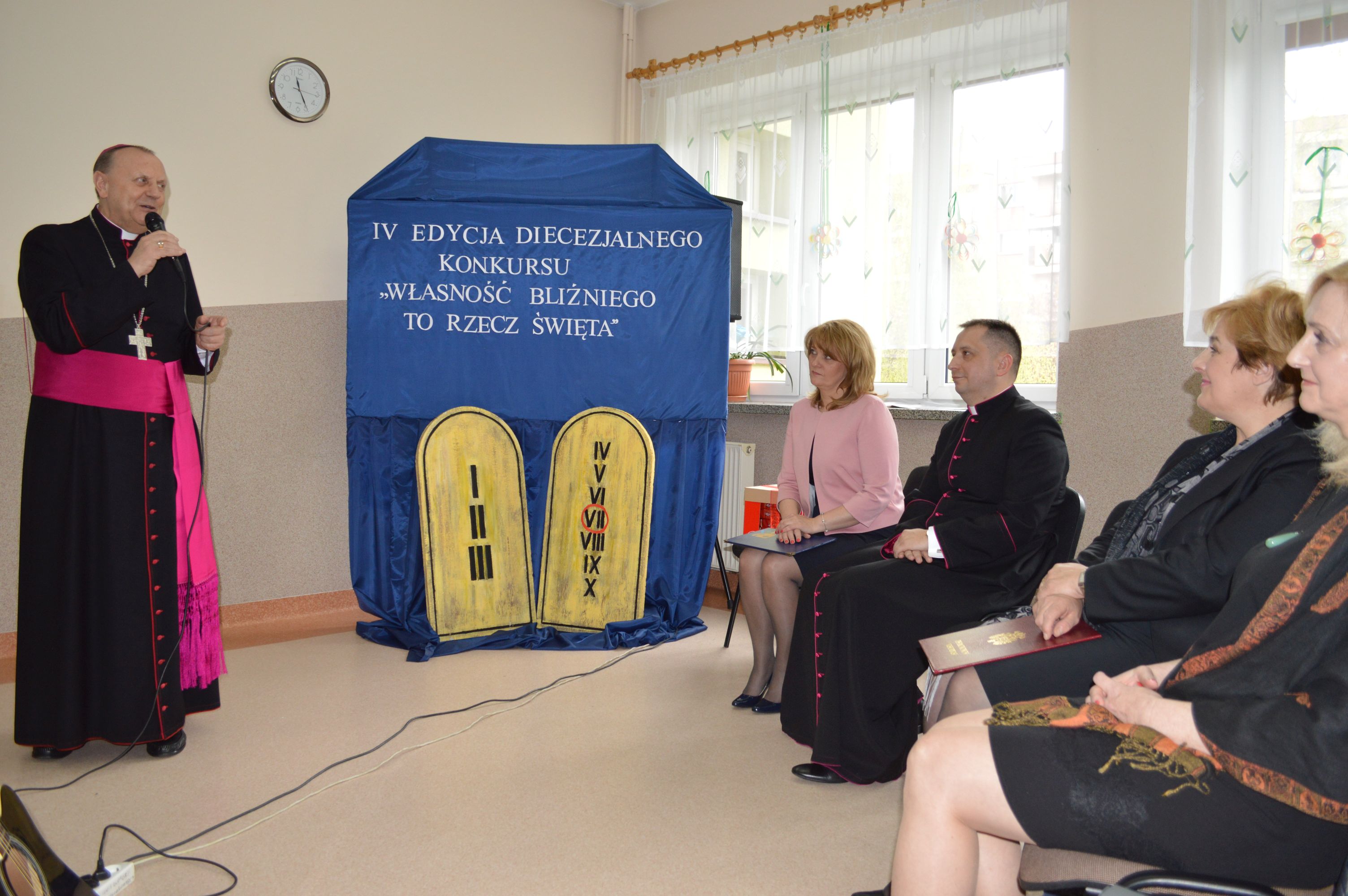 W czwartek, 27 kwietnia 2017r. w Zespole Szkół Specjalnych im. Jana Pawła II w Sokołowie Podlaskim odbyło się podsumowanie IV edycji diecezjalnego konkursu dla szkół i ośrodków specjalnych z terenu diecezji drohiczyńskiej województwa mazowieckiego, podlaskiego i lubelskiego pt. „Własność bliźniego to rzecz święta”. Honorowy patronat nad konkursem objął J.E. Ks. Biskup Tadeusz Pikus, Senator RP Waldemar Kraska, Starosta Powiatu Sokołowskiego Leszek Iwaniuk, Aurelia Michałowska Mazowiecki Kurator Oświaty, Jadwiga Mariola Szczypiń Podlaski Kurator Oświaty, Instytut Teologii Pastoralnej i Katechetyki Katolickiego Uniwersytetu Lubelskiego im. Jana Pawła II, Parafia Św. Jana Bosko. Organizatorami konkursu byli: Zespół Szkół Specjalnych im. Jana Pawła II, Wydział Katechezy i Szkolnictwa Katolickiego Kurii Diecezjalnej w Drohiczynie, Caritas Diecezji Drohiczyńskiej. W konkursie wzięło udział 92 uczniów z 11 placówek. Głównym celem konkursu było skierowanie uwagi na zagadnienia związane z bezprawnym przywłaszczaniem dóbr innego człowieka. Uczniowie poprzez udział w konkursie pogłębili znajomość VII przykazania Dekalogu „ Nie kradnij”. Zaowocowało to rozwinięciem wyobraźni oraz twórczych umiejętności uczestników. Kreatywne działanie dzieci pozytywnie wpłynęło na integrację całych rodzin oraz społeczności szkolnych i lokalnych. Spośród uczestników, którzy nadesłali prace, wyłoniono 34 laureatów w trzech kategoriach.
