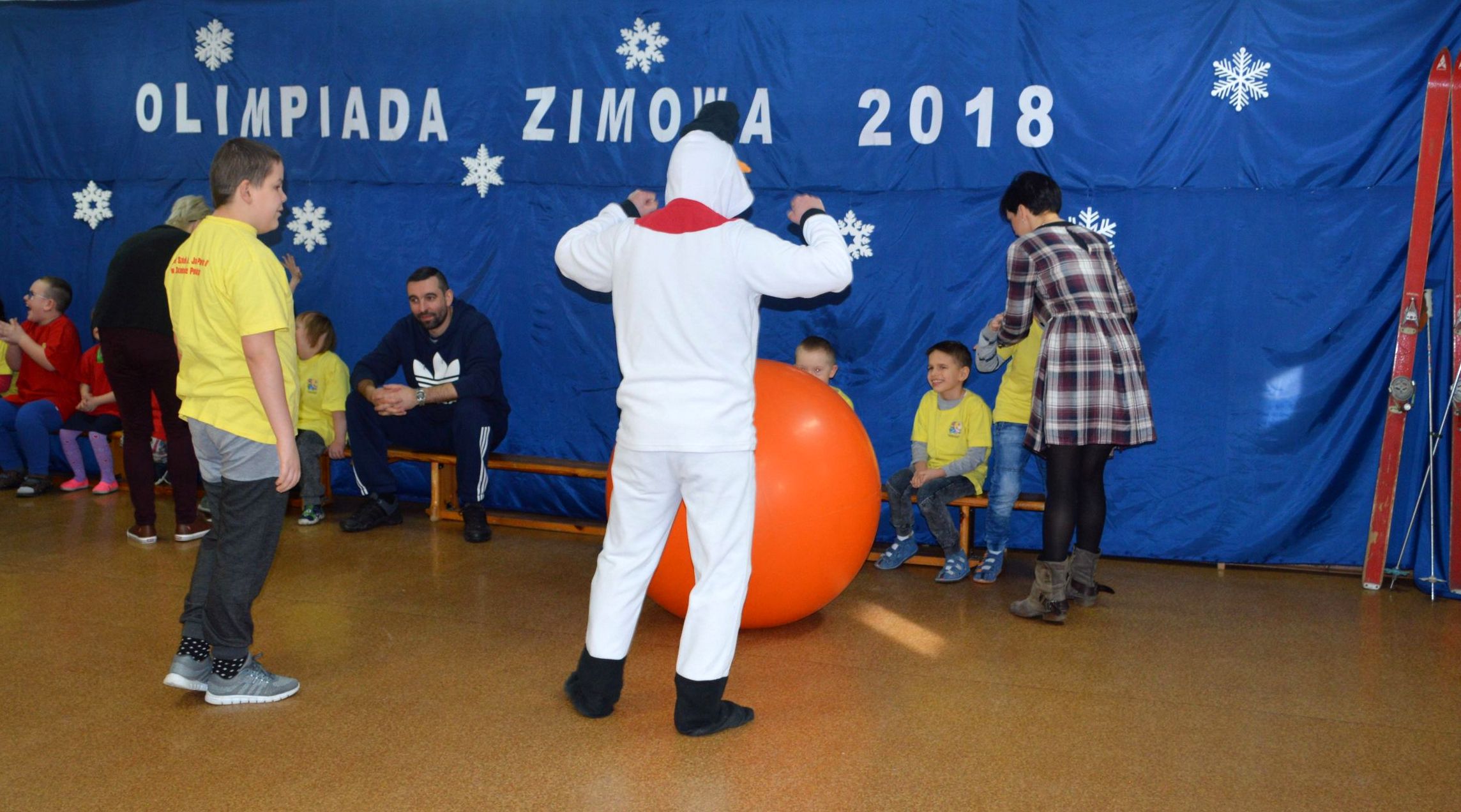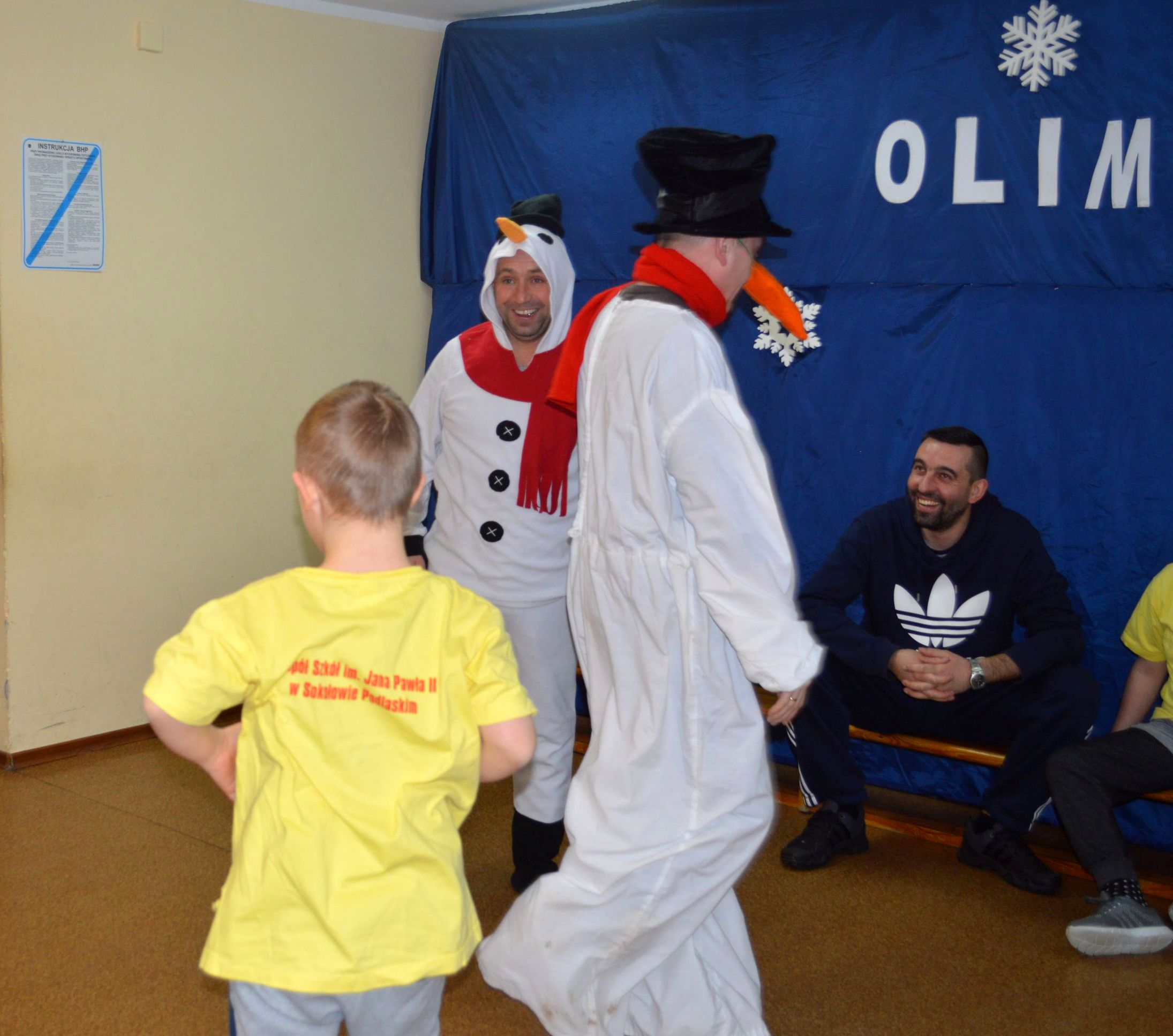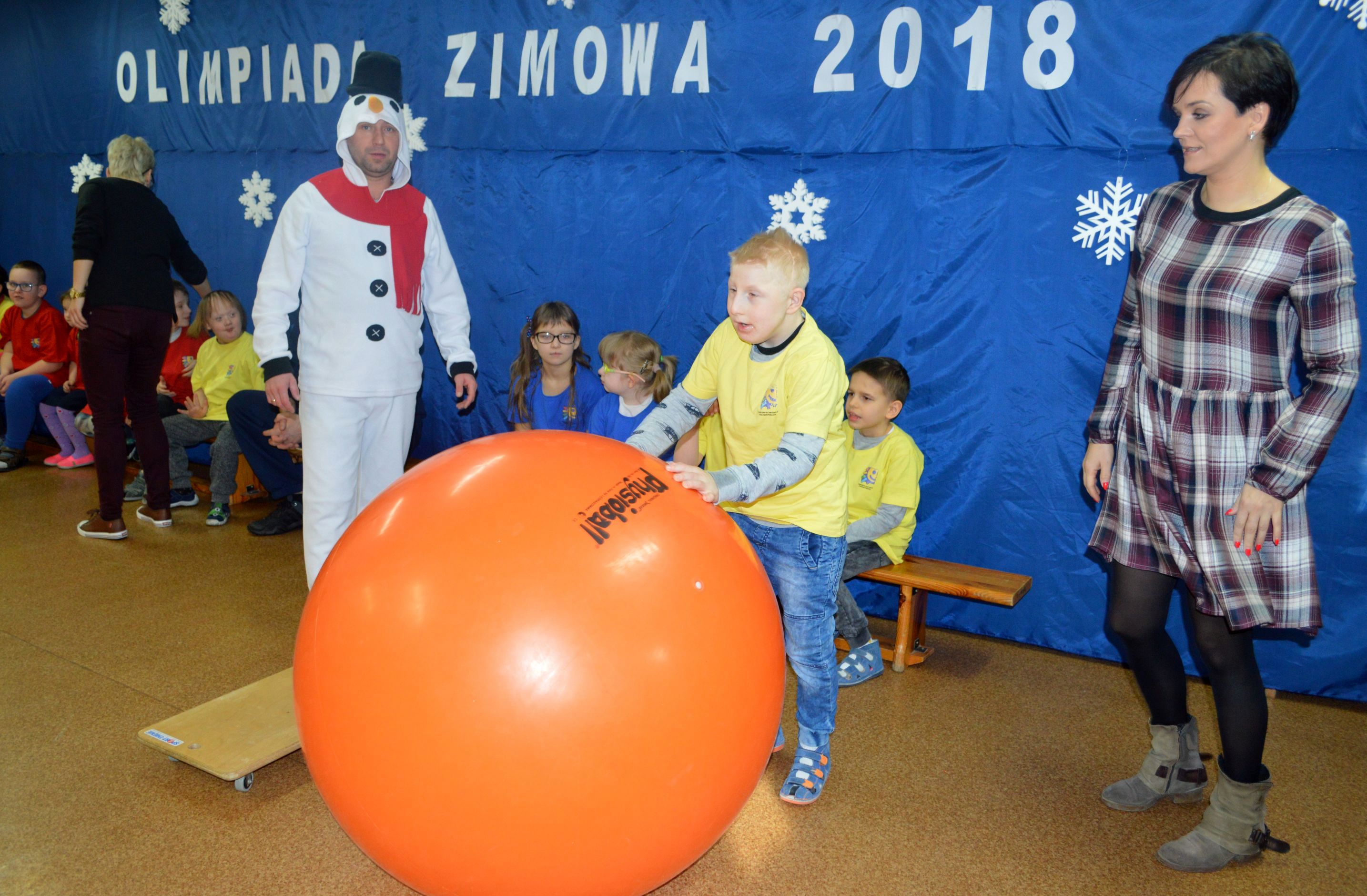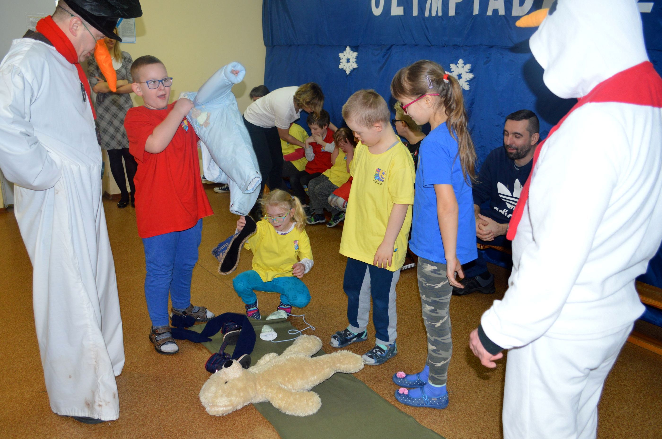 Toczenie wielkiej piłki „ kuli śnieżnej” , rzut piłeczkami „śnieżkami” do kosza, ubieranie miśka w „zimowy strój„, wieszanie „sopli„, przejście przez tunel „zaspę”, jazda na „sankach” to tylko niektóre z konkurencji, z którymi przyszło zmierzyć się naszym uczniom podczas Olimpiady. W sportowych zmaganiach pomagały dzieciom dwa sympatyczne bałwanki, w których rolę wcielili się p. Grzegorz Nowotniak i p. Przemysław Mroczkowski. Wszyscy bawili się doskonale a ich trud został nagrodzony. Dzieci z rąk pana wicedyrektora Waldemara Prokopczuka otrzymali złote medale ufundowane przez Radę Rodziców.
