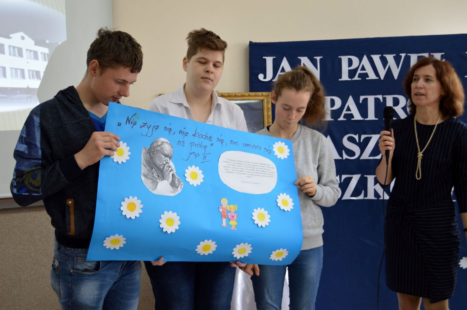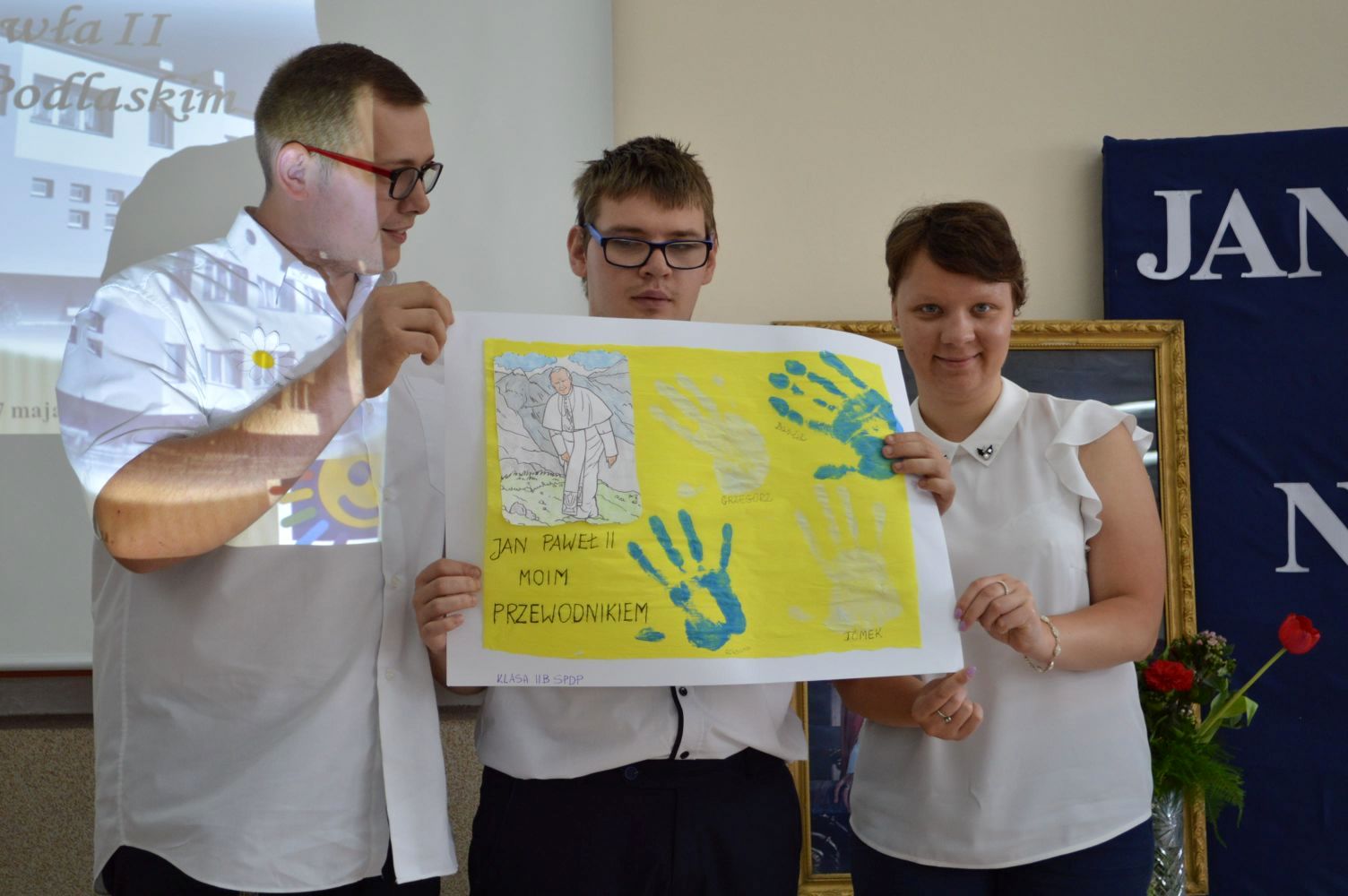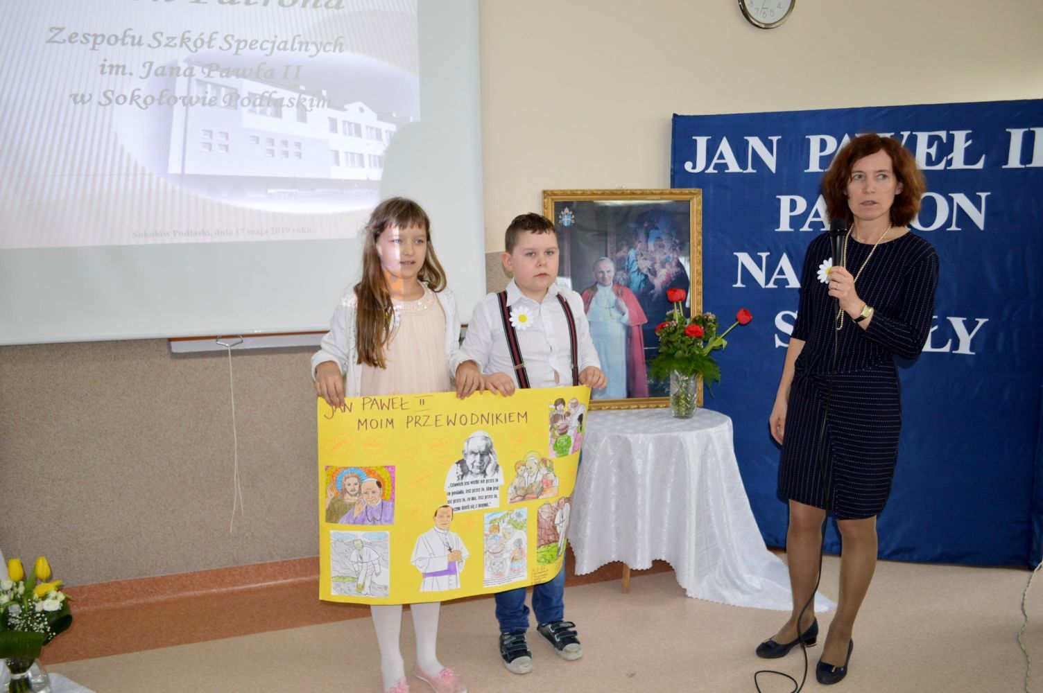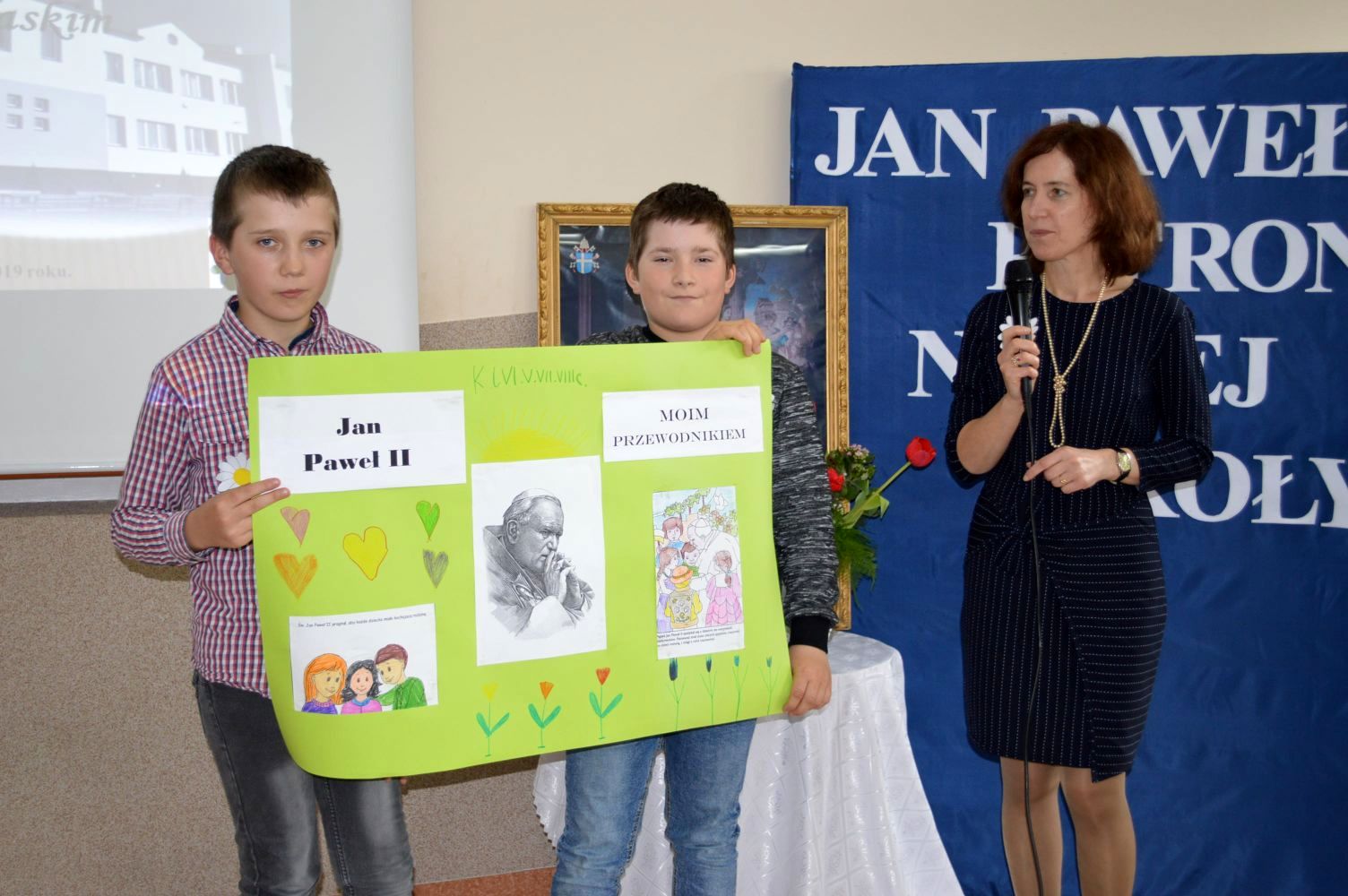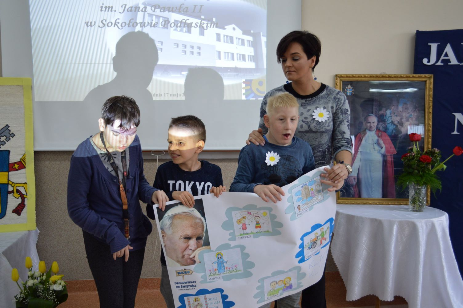 Jak co roku, 18 maja,obchodzimy uroczyście Dzień Patrona Szkoły – Św. Jana Pawła II. W przeddzień, czyli już w piątek, cała społeczność szkolna zaangażowana była w obchody „Dnia Patrona”, które pełne były wesołych zabaw, konkursów plastycznych, śpiewu i oczywiście modlitwy do Naszego Patrona podczas Mszy Świętej, po której złożyliśmy kwiaty i zapaliliśmy lampkę pod pomnikiem Jana Pawła II, przy kościele Św, Jana Bosko. Święty Janie Pawle II – „Nasz Patronie”, bądź nam niezmiennie przewodnikiem w każdej chwili – teraz, w czasie nauki i zabawy, i później, podczas całego naszego życia!