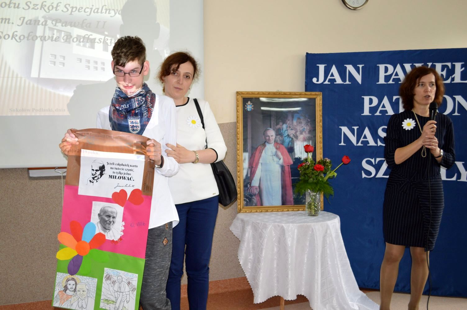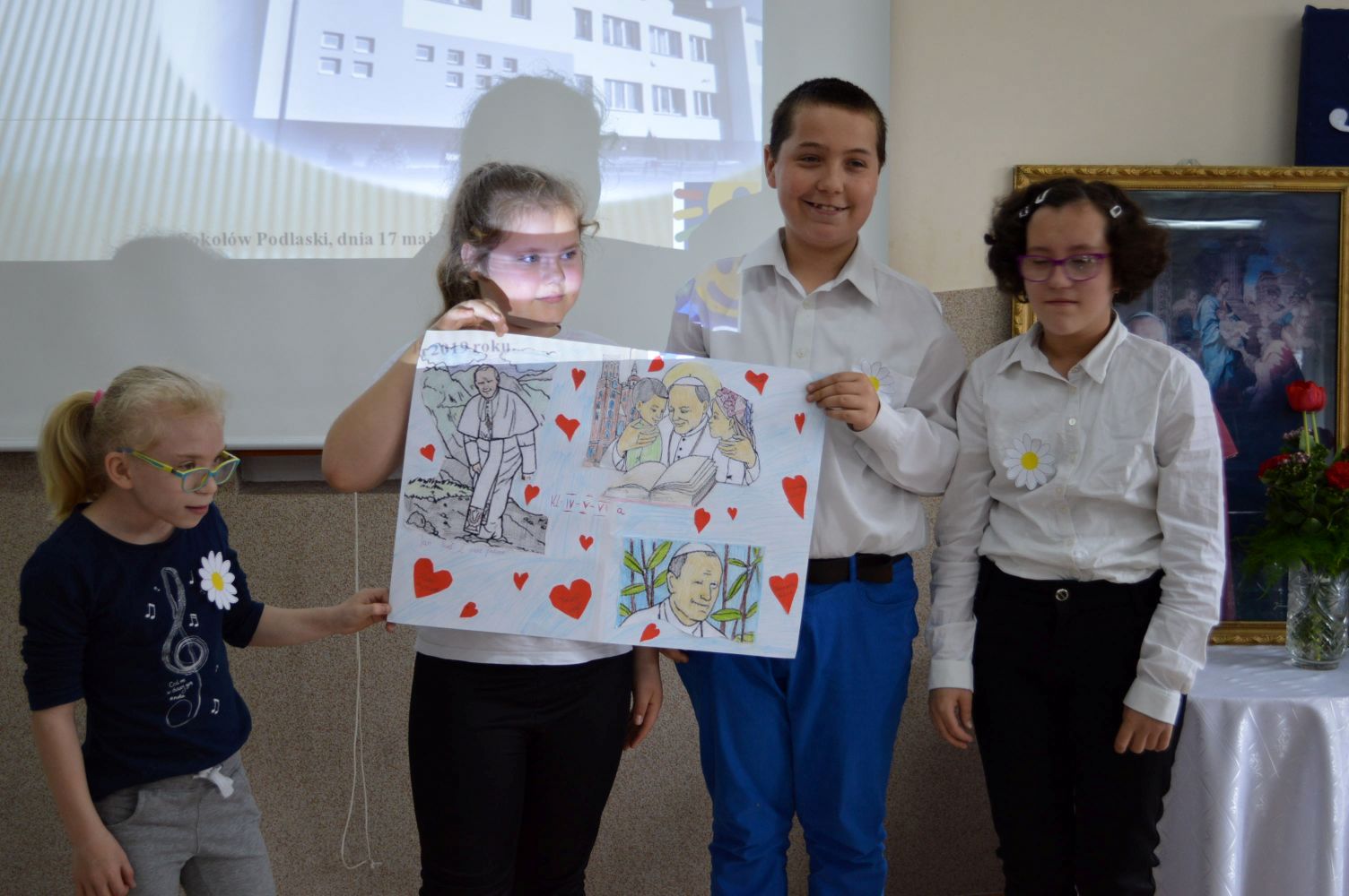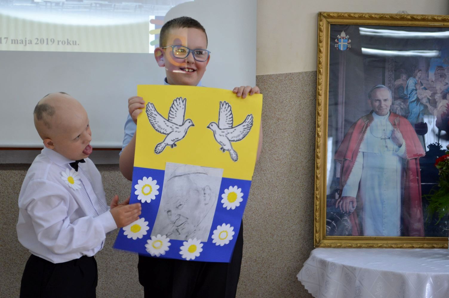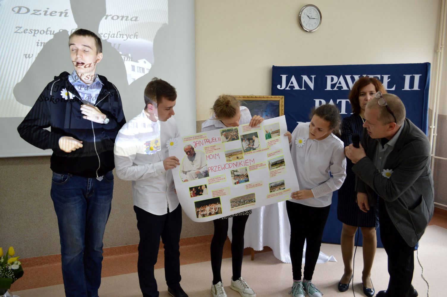 Jak co roku, 18 maja,obchodzimy uroczyście Dzień Patrona Szkoły – Św. Jana Pawła II. W przeddzień, czyli już w piątek, cała społeczność szkolna zaangażowana była w obchody „Dnia Patrona”, które pełne były wesołych zabaw, konkursów plastycznych, śpiewu i oczywiście modlitwy do Naszego Patrona podczas Mszy Świętej, po której złożyliśmy kwiaty i zapaliliśmy lampkę pod pomnikiem Jana Pawła II, przy kościele Św, Jana Bosko. Święty Janie Pawle II – „Nasz Patronie”, bądź nam niezmiennie przewodnikiem w każdej chwili – teraz, w czasie nauki i zabawy, i później, podczas całego naszego życia!