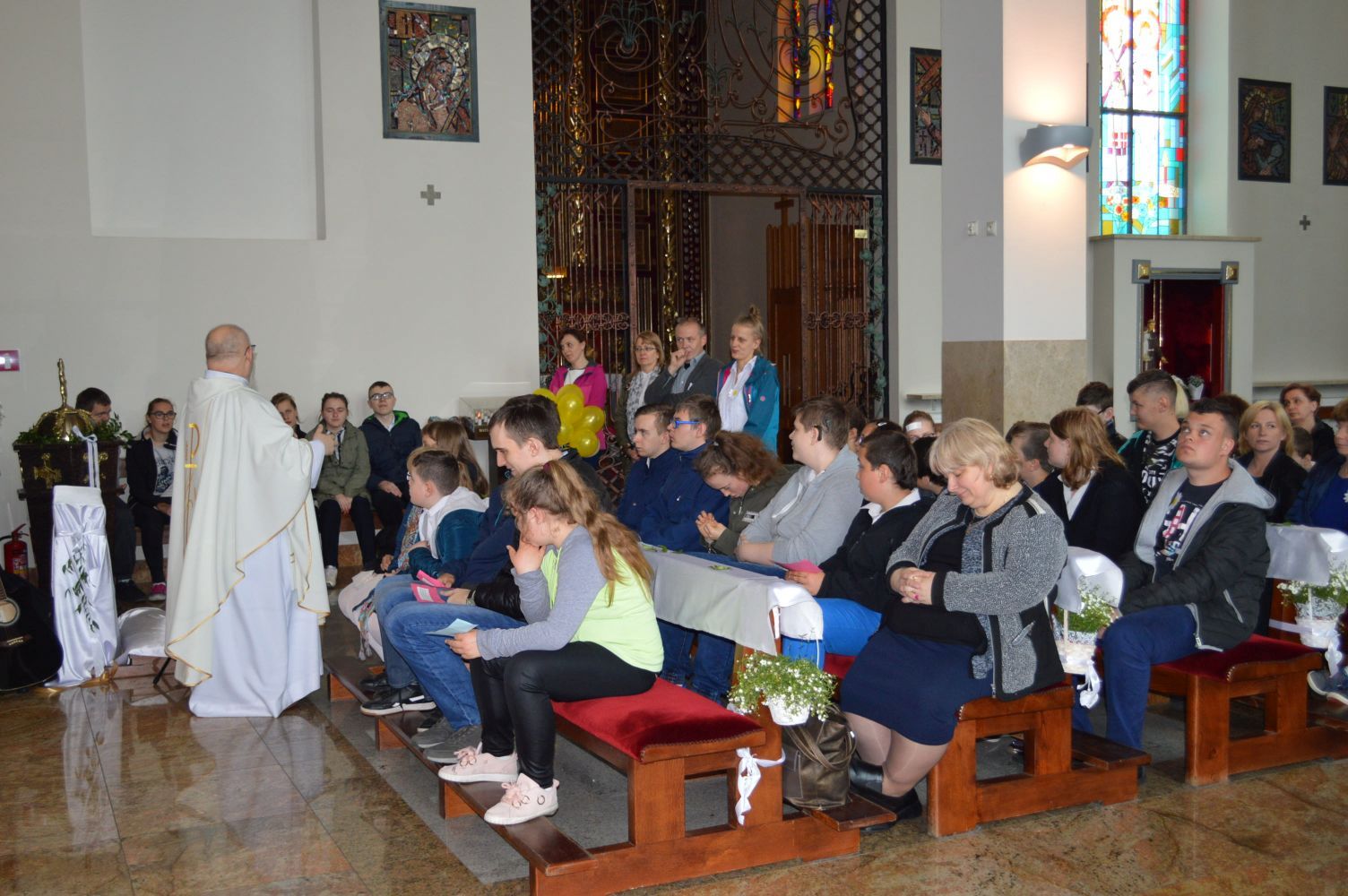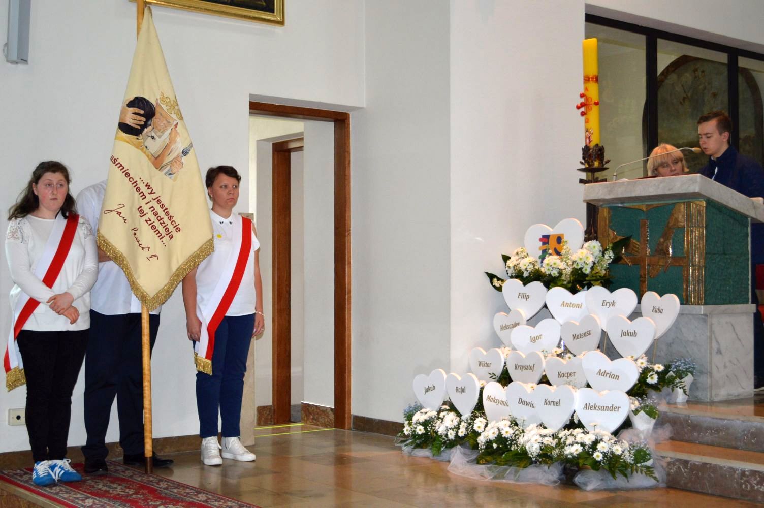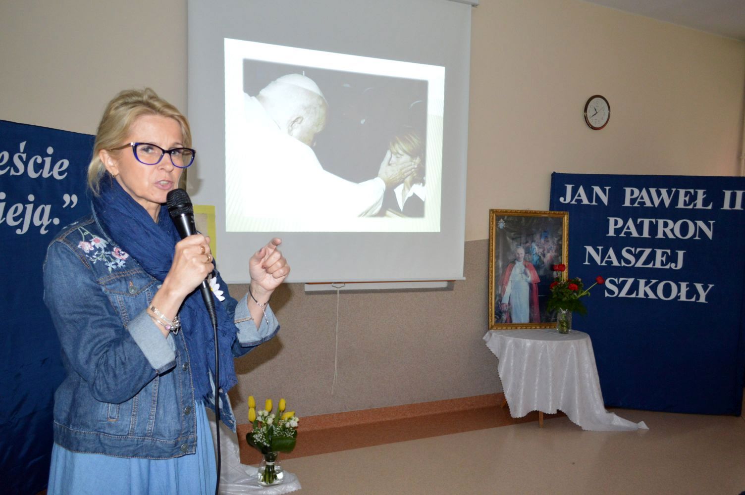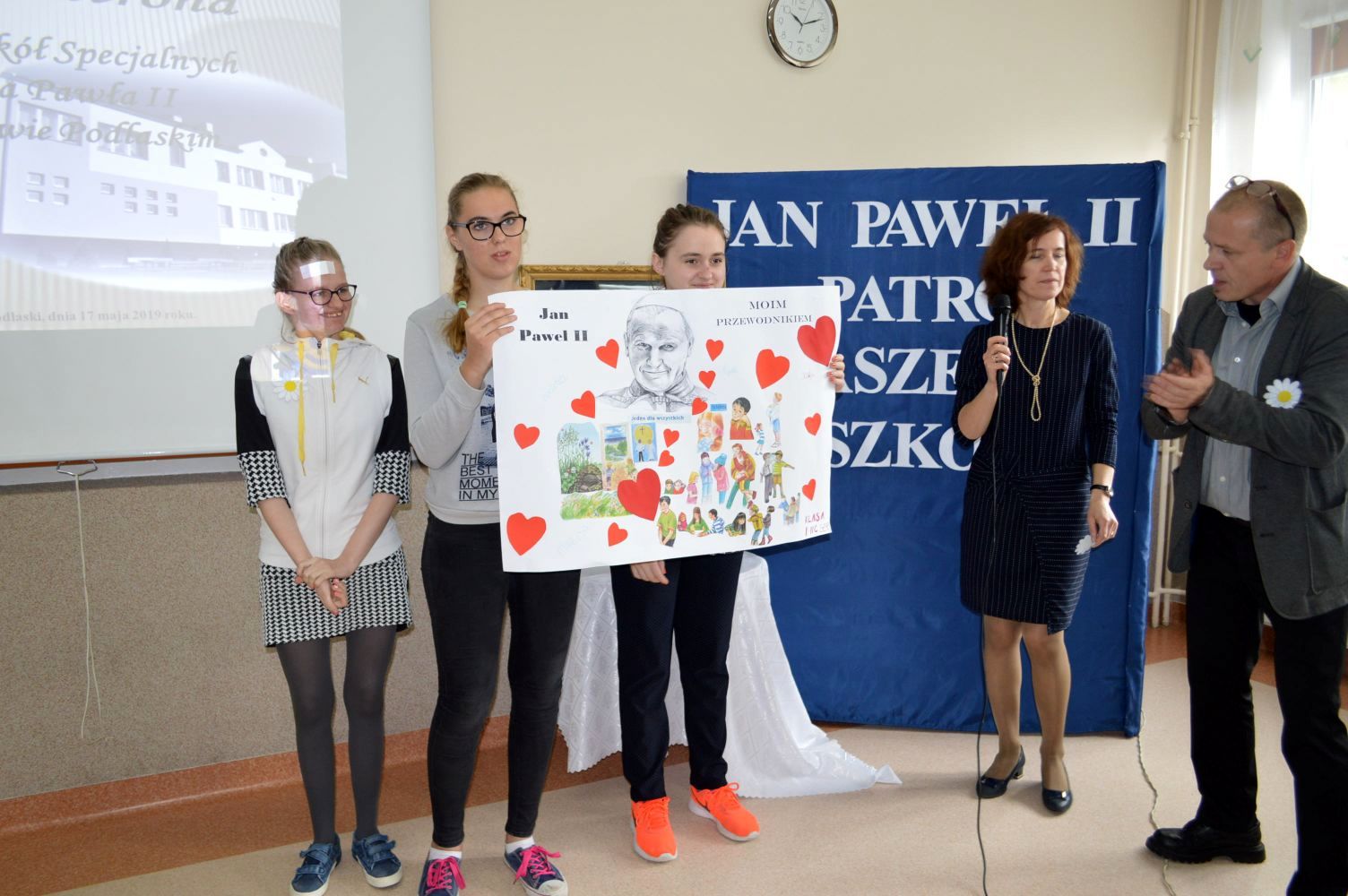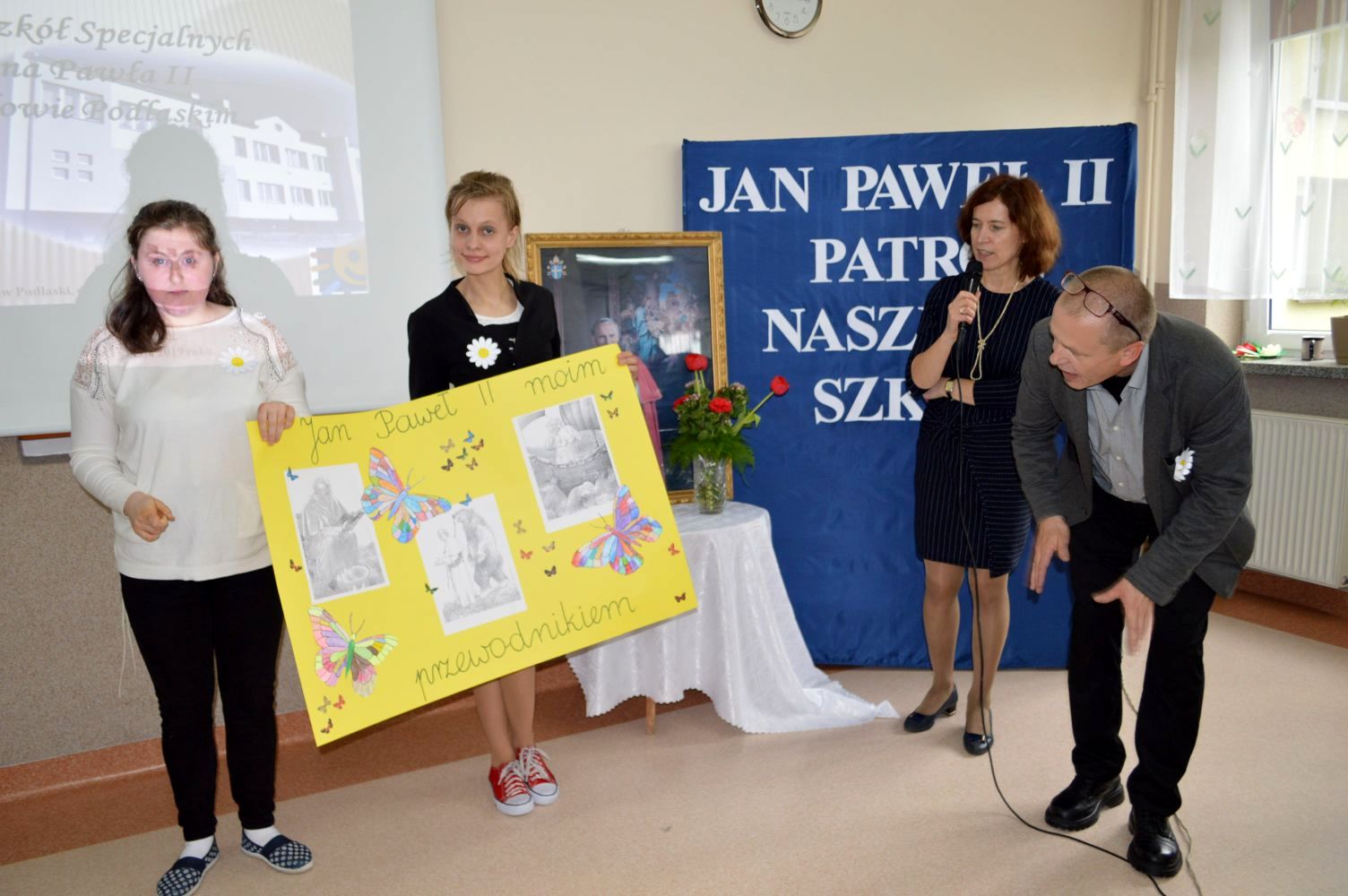 Jak co roku, 18 maja,obchodzimy uroczyście Dzień Patrona Szkoły – Św. Jana Pawła II. W przeddzień, czyli już w piątek, cała społeczność szkolna zaangażowana była w obchody „Dnia Patrona”, które pełne były wesołych zabaw, konkursów plastycznych, śpiewu i oczywiście modlitwy do Naszego Patrona podczas Mszy Świętej, po której złożyliśmy kwiaty i zapaliliśmy lampkę pod pomnikiem Jana Pawła II, przy kościele Św, Jana Bosko. Święty Janie Pawle II – „Nasz Patronie”, bądź nam niezmiennie przewodnikiem w każdej chwili – teraz, w czasie nauki i zabawy, i później, podczas całego naszego życia!