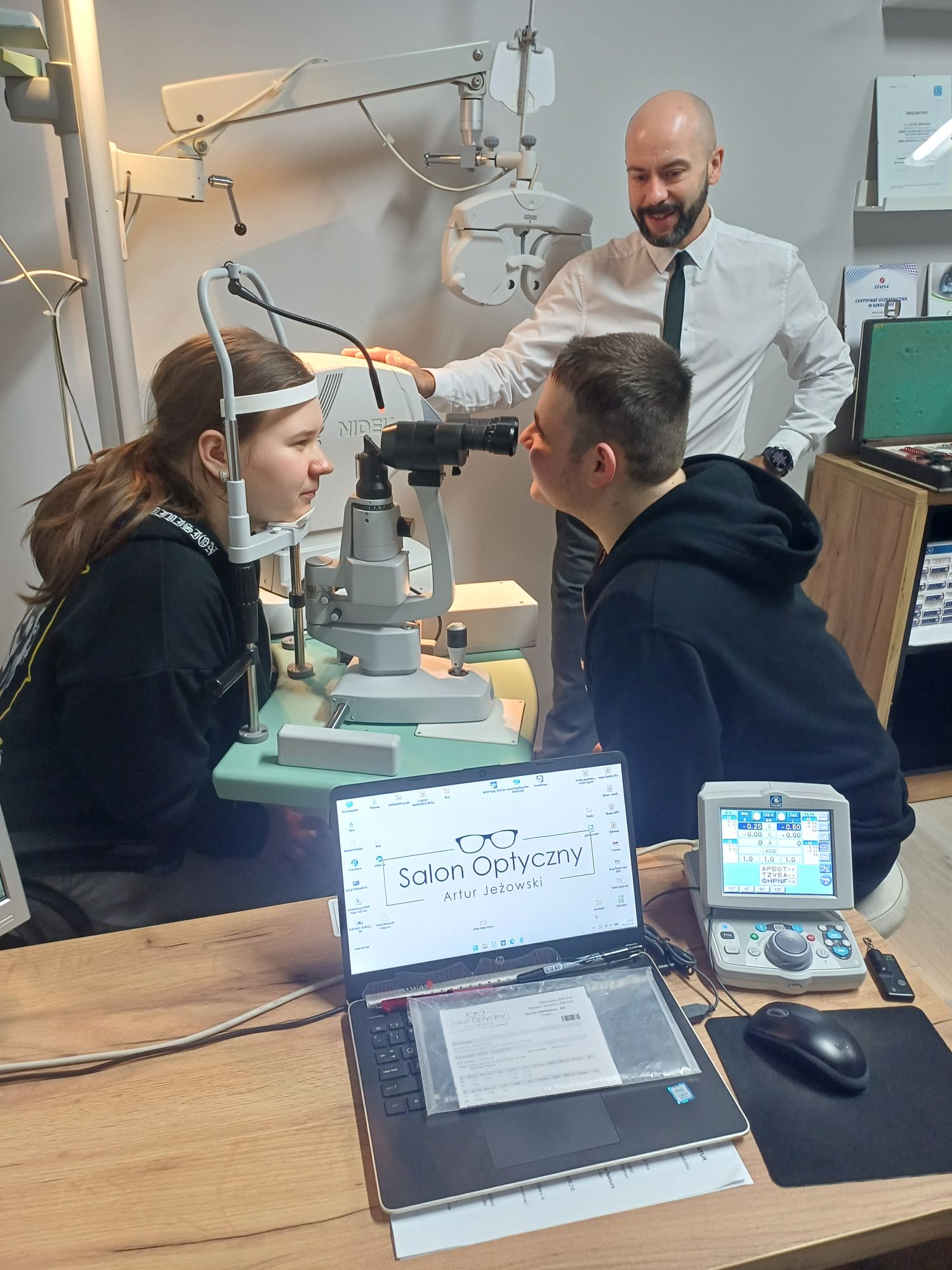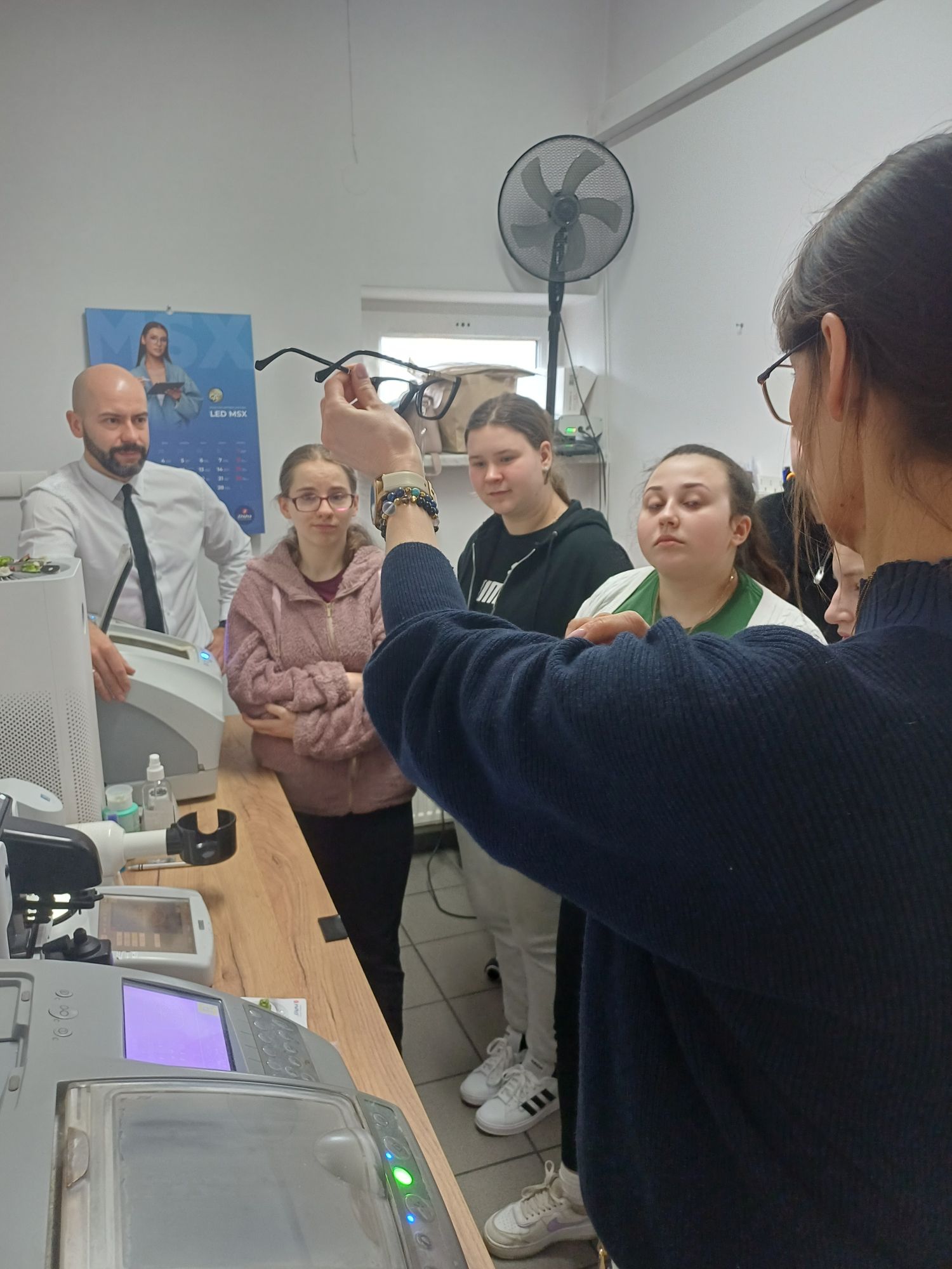 Celem wyjścia było zapoznanie się z pracą optyka oraz poznanie zasad dbania o wzrok. Pracownik salonu opowiedział o zawodzie optyka, wyjaśnił na czym polega badanie wzroku oraz jakie są najczęstsze wady wzroku. Uczniowie dowiedzieli się również, w jaki sposób dobiera się odpowiednie okulary oraz soczewki kontaktowe. Podczas wizyty uczniowie mieli możliwość zobaczenia specjalistycznego sprzętu używanego do badania wzroku. Uczniowie obejrzeli także różne rodzaje oprawek okularowych i dowiedzieli się z jaki materiałów są wykonane. Wizyta w salonie optycznym była bardzo interesująca i pouczająca. Uczniowie zdobyli nową wiedzę na temat zdrowia oczu oraz pracy optyka. Spotkanie pozwoliło lepiej zrozumieć jak ważna jest regularna kontrola wzroku i właściwa ochrona oczu. Na zakończenie uczniowie podziękowali Panu Arturowi Jeżowskiemu oraz pracownikom salonu optycznego za poświęcony czas oraz przekazaną wiedzę.