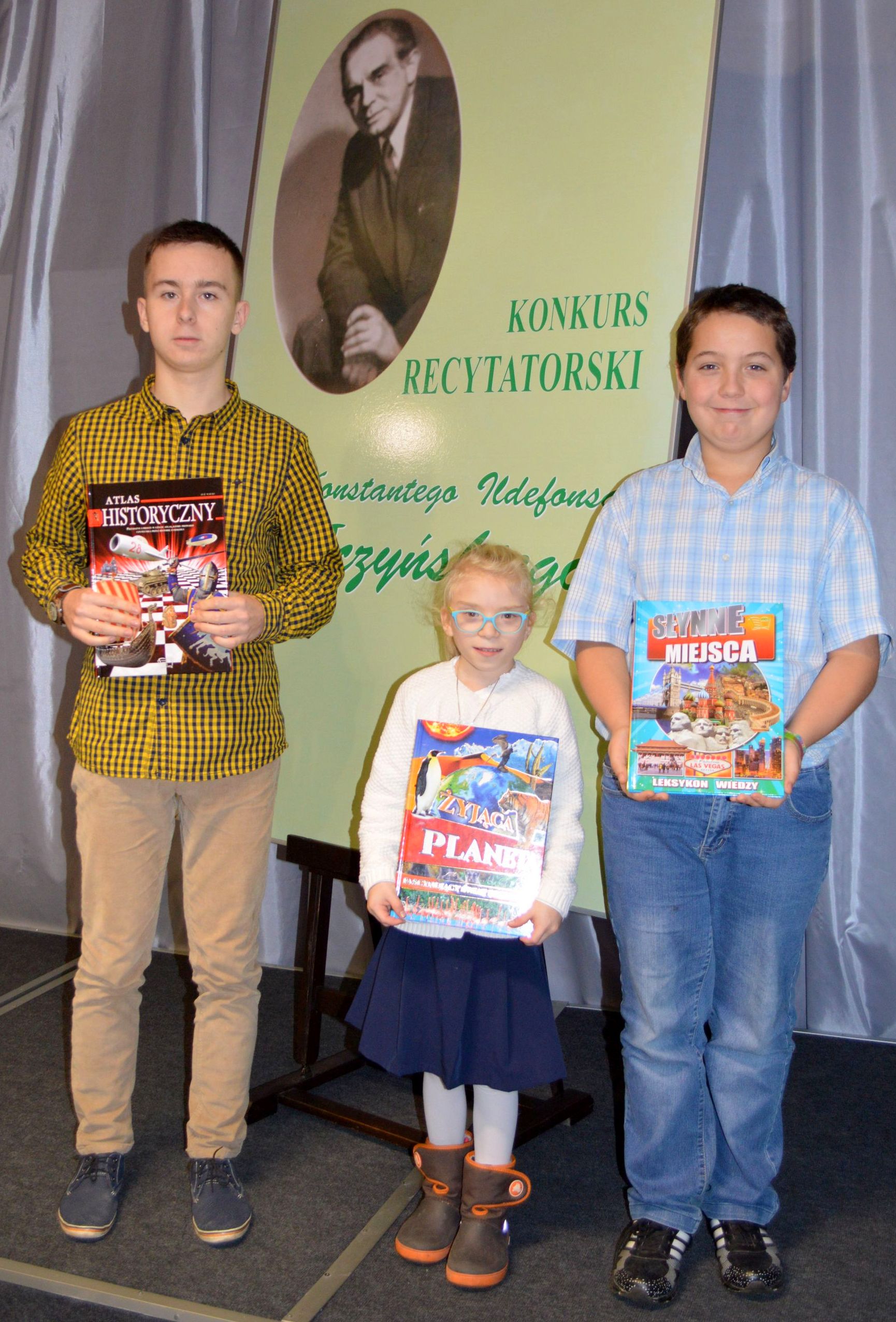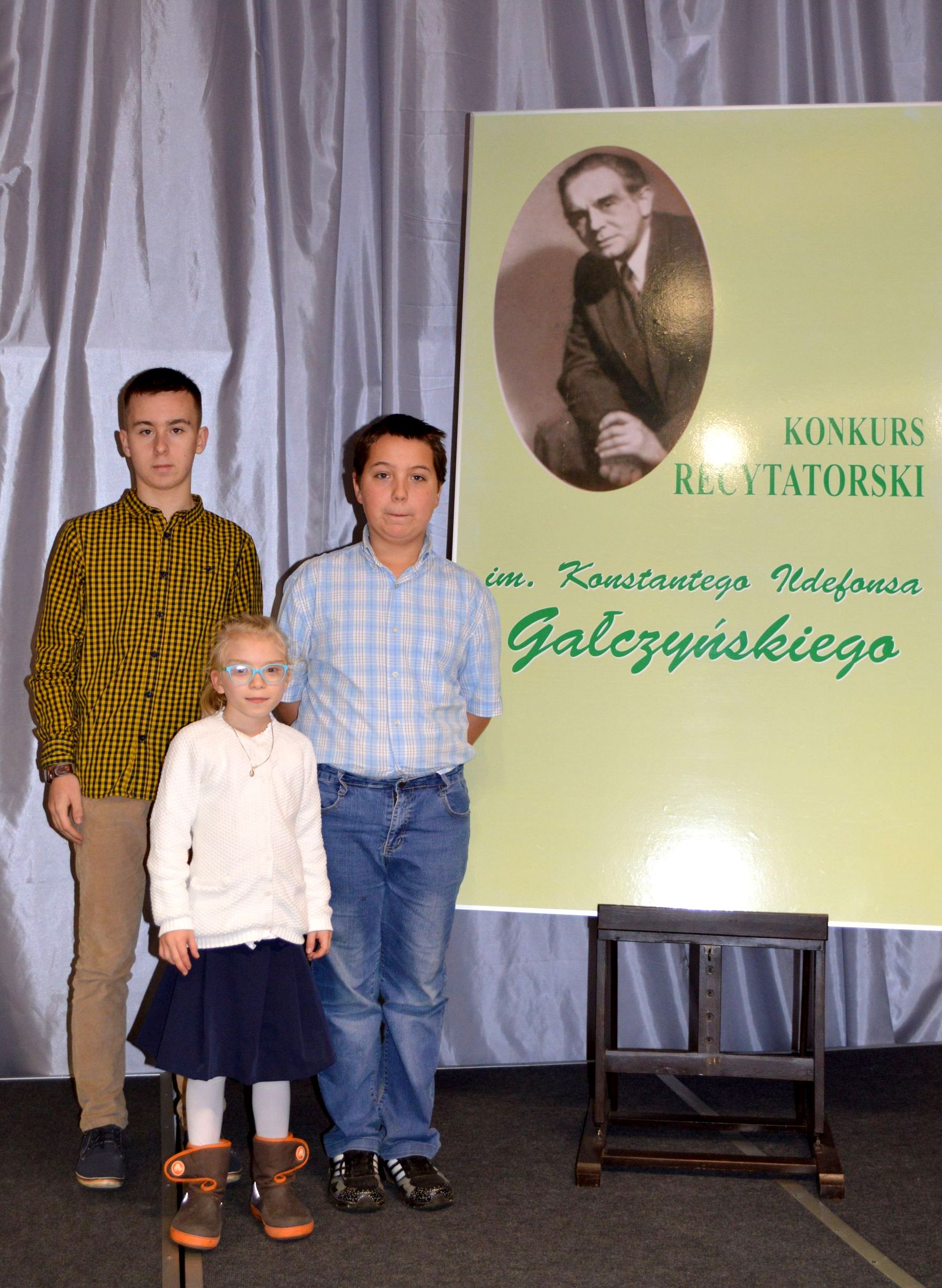 W środę, 15 listopada 2017r. w Miejskiej Bibliotece Publicznej w Sokołowie Podlaskim odbył się  „X Powiatowy Konkurs Recytatorski im. Konstantego Ildefonsa Gałczyńskiego”. Wśród  licznie występujących uczestników konkursu byli też nasi uczniowie. Dziękujemy Pani Barbarze Rozbickiej za przygotowanie uczniów i Pani Oldze Bielarskiej za opiekę nad nimi podczas występów. Uczniowie otrzymali dyplomy i nagrody książkowe za udział w konkursie. Gratulacje dla Dominiki Kutnik i Kuby Majchrzyka -kategoria klasy IV-VI oraz dla Łukasza Żaka kategoria klasy gimnazjalne.