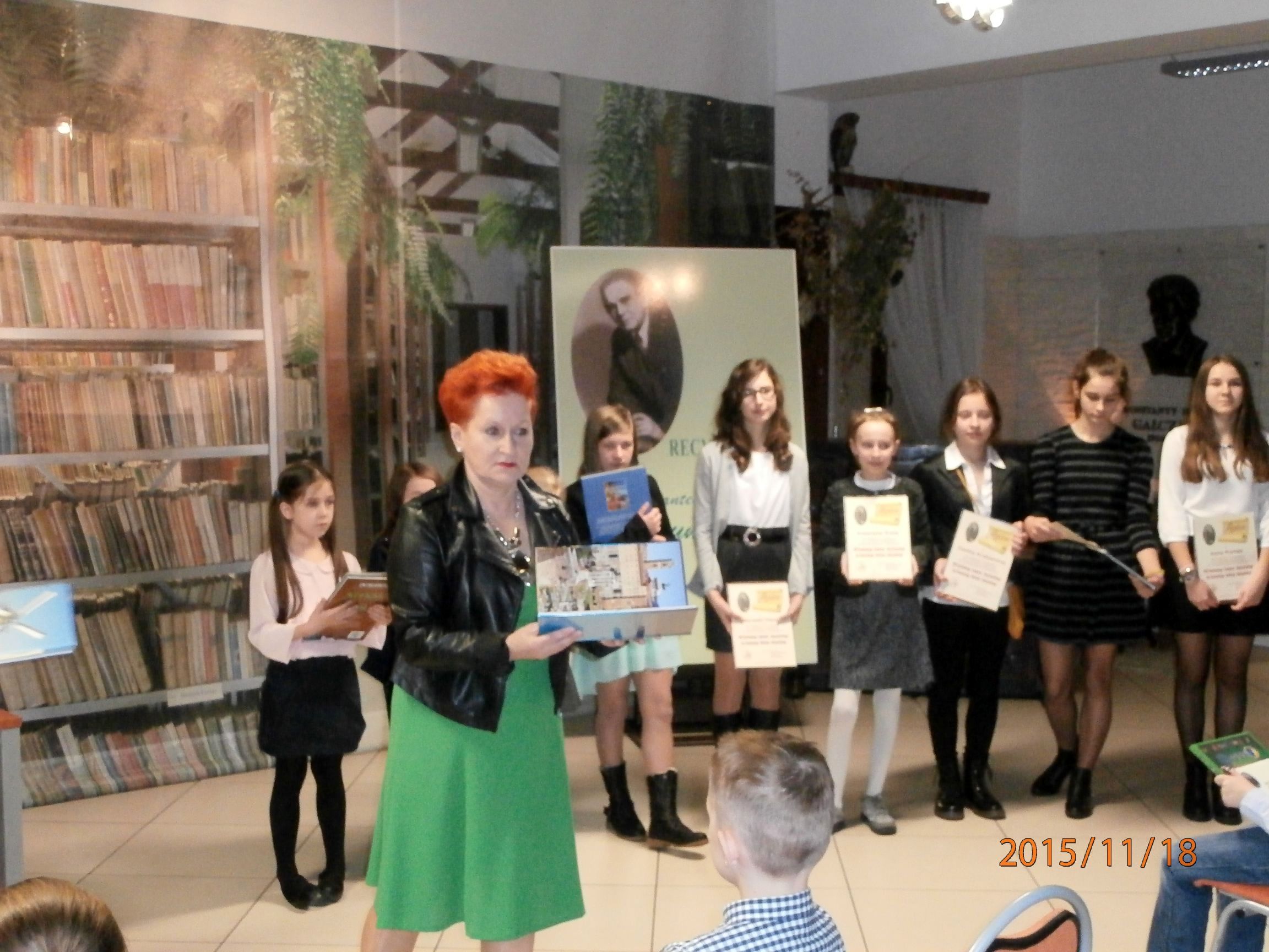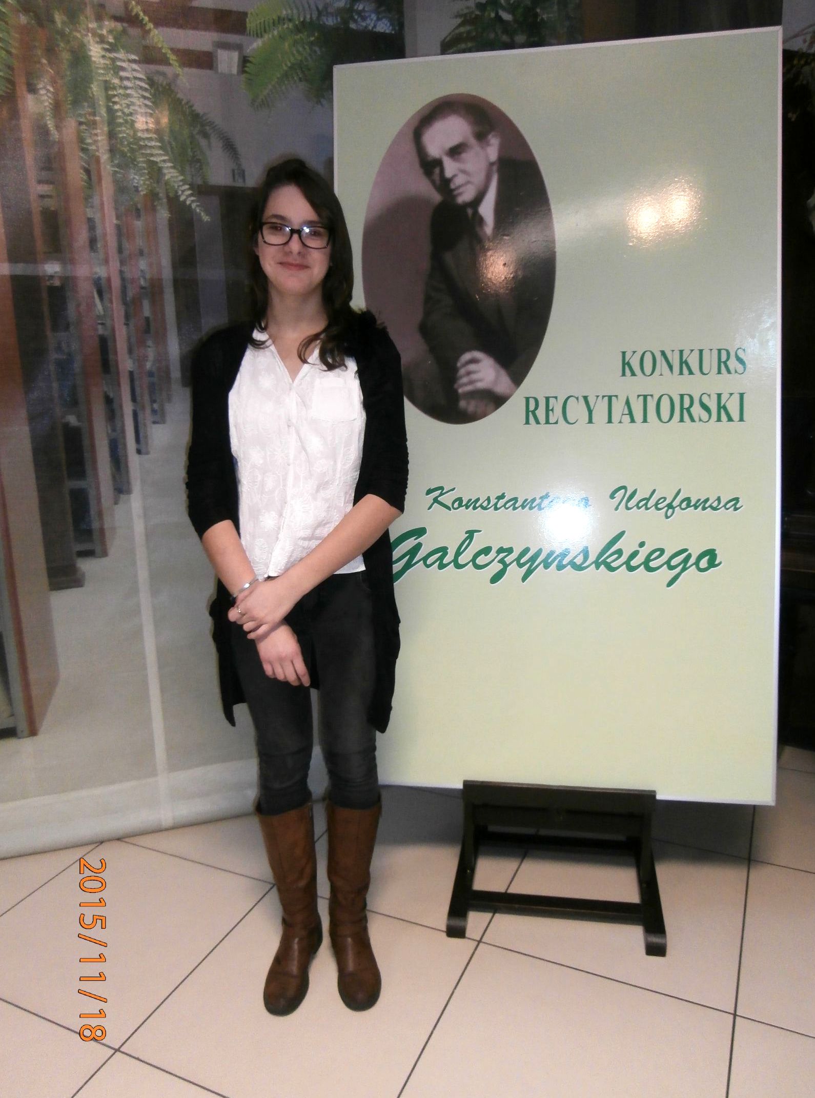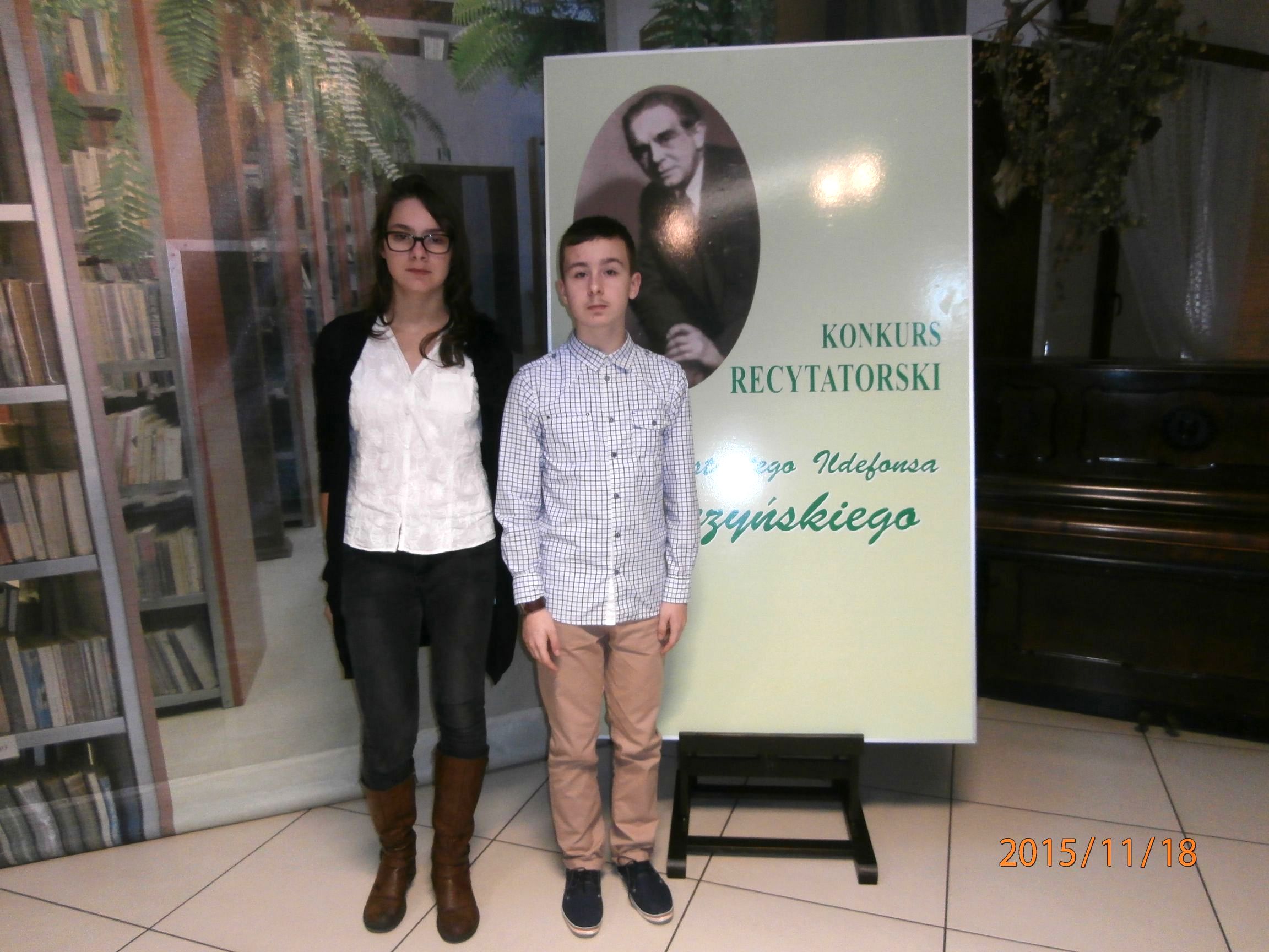 18 listopada w Miejskiej Bibliotece Publicznej w Sokołowie Podlaskim odbył się VIII już Powiatowy Konkurs Recytatorski im. Konstantego Ildefonsa Gałczyńskiego. Tradycyjnie, jak co roku, Pani Mariola Stolarczuk – nauczyciel bibliotekarz, przygotowała dwoje uczniów z naszej szkoły. Udział w konkursie wzięli Sara Kuć i Łukasz Żak z gimnazjum. Otrzymali pamiątkowe książki i okolicznościowe dyplomy. Gratulujemy i dziękujemy uczniom i Pani z Biblioteki.