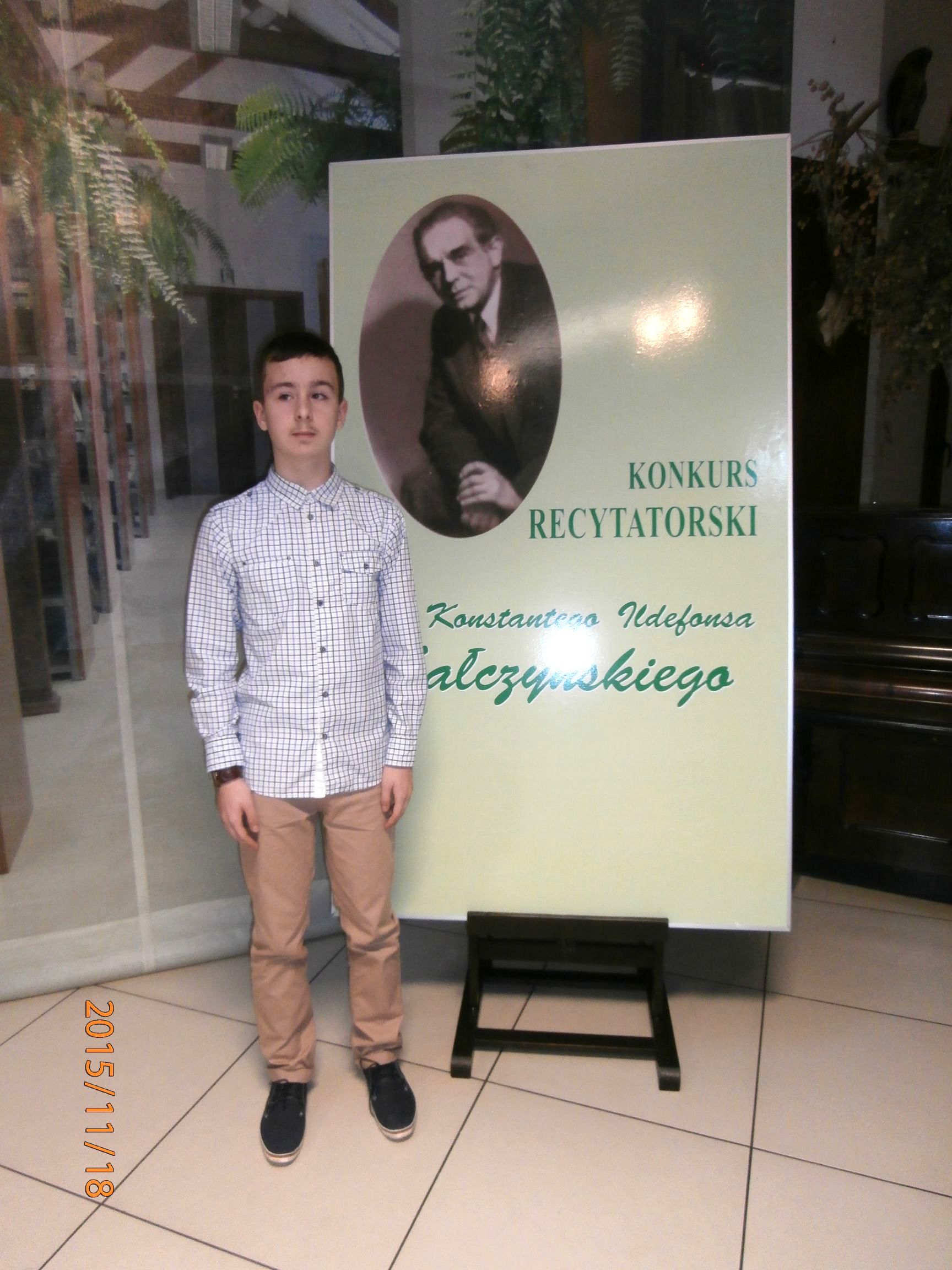 Kolejne sukcesy naszych uczniów w Konkursie Recytatorskim im. Konstantego Ildefonsa Gałczyńskiego. W dniu 21 listopada br. uczniowie naszej szkoły wzięli udział w XI Powiatowym Konkursie Recytatorskim im. Konstantego Ildefonsa Gałczyńskiego w Sokołowie Podlaskim, w eliminacjach miejskich. Nasz Zespół reprezentowało czworo wychowanków: Klaudia Ciosek(uczennica klasy IV),Dominika Kutnik ( uczennica klasy V),Kuba Majchrzyk ( uczeń klasy VI) i Łukasz Żak ( uczeń klasy I SPDP). W wyborze wierszy i ich interpretacji uczniowie mogli liczyć na pomoc Pani bibliotekarki Grażyny Kobylińskiej. Wychowankowie w ciekawy sposób zaprezentowali mniej znane utwory, z bogatego repertuaru poety, co zostało docenione przez komisję konkursową. Mimo wyrównanego poziomu recytatorów i naszemu uczniowi udało się odnieść sukces. Kuba Majchrzyk otrzymał wyróżnienie w grupie wiekowej uczniów klas IV-VI. Pozostali wychowankowie również twórczo zinterpretowali prezentowane przez siebie utwory.